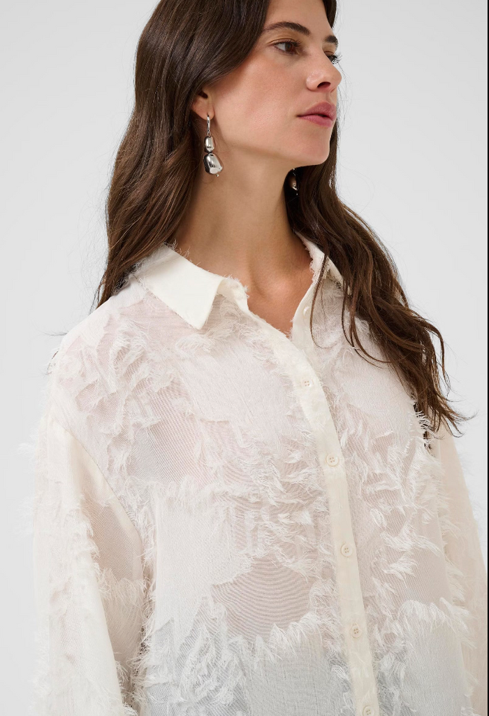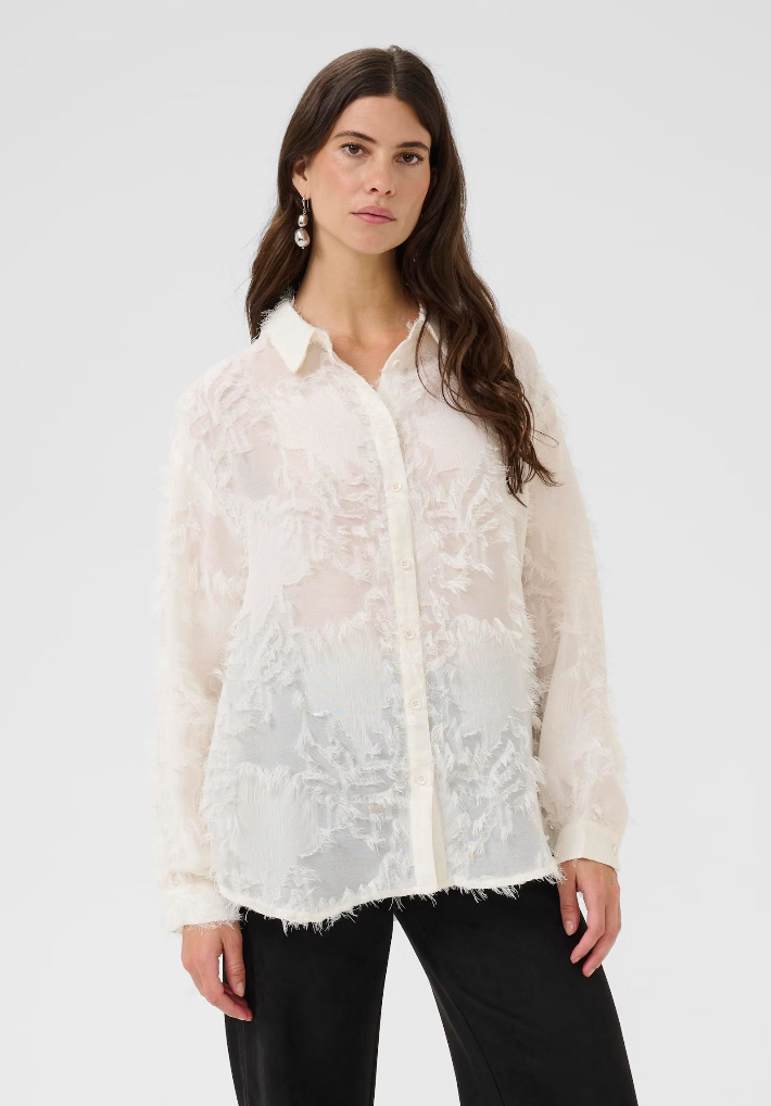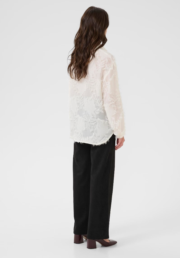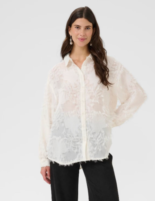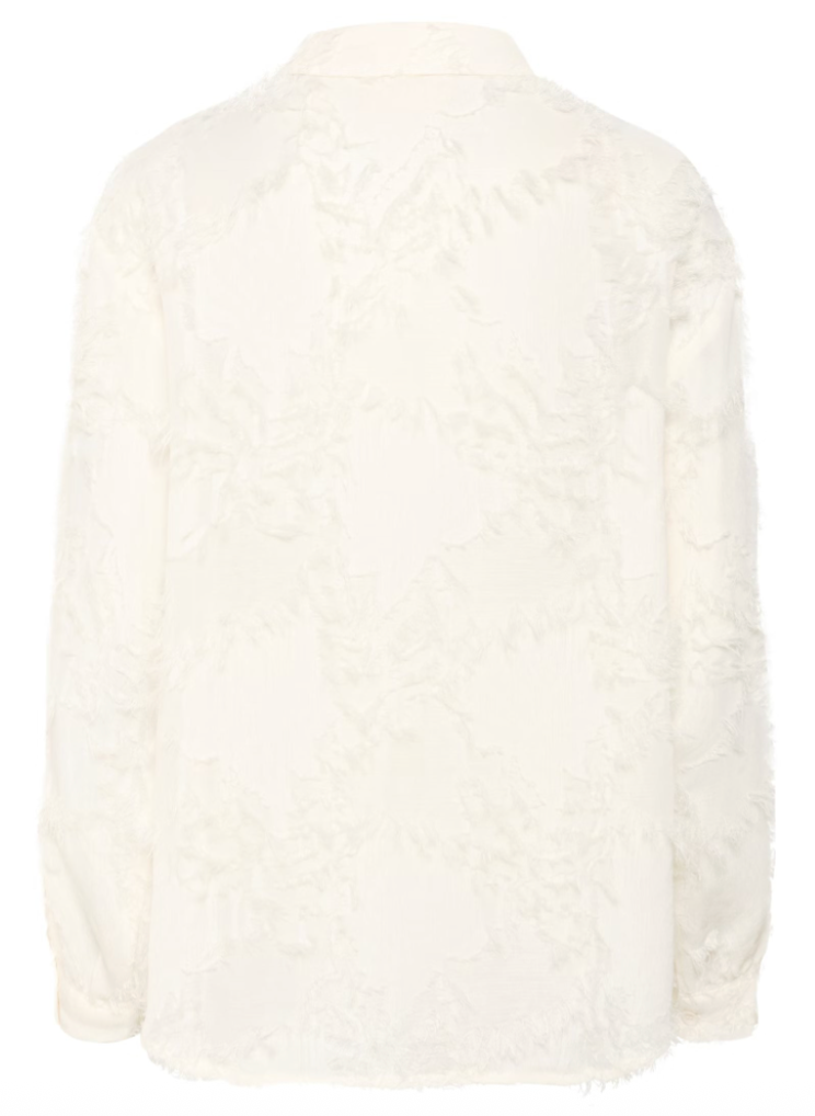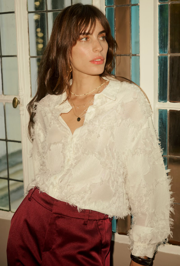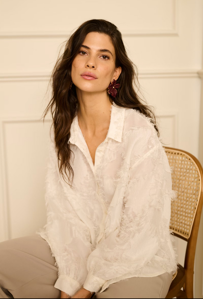 This women's blouse features a relaxed fit, classic shirt collar, and full-length button closure. Soft, textural fabric and long sleeves provide effortless comfort for both work and casual occasions.
