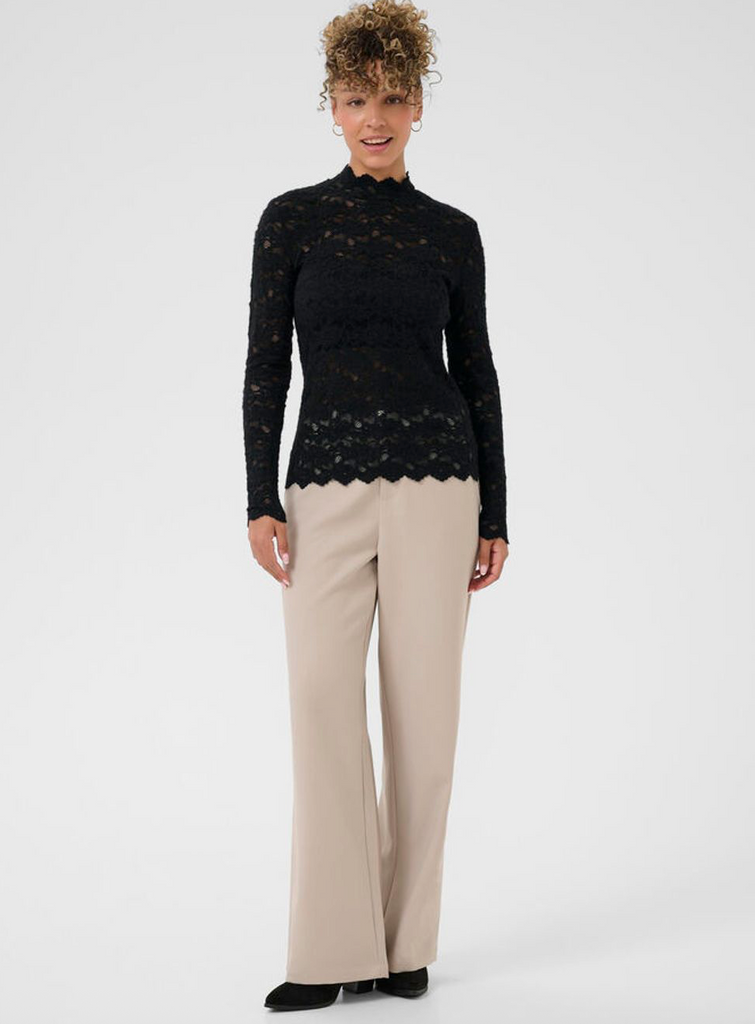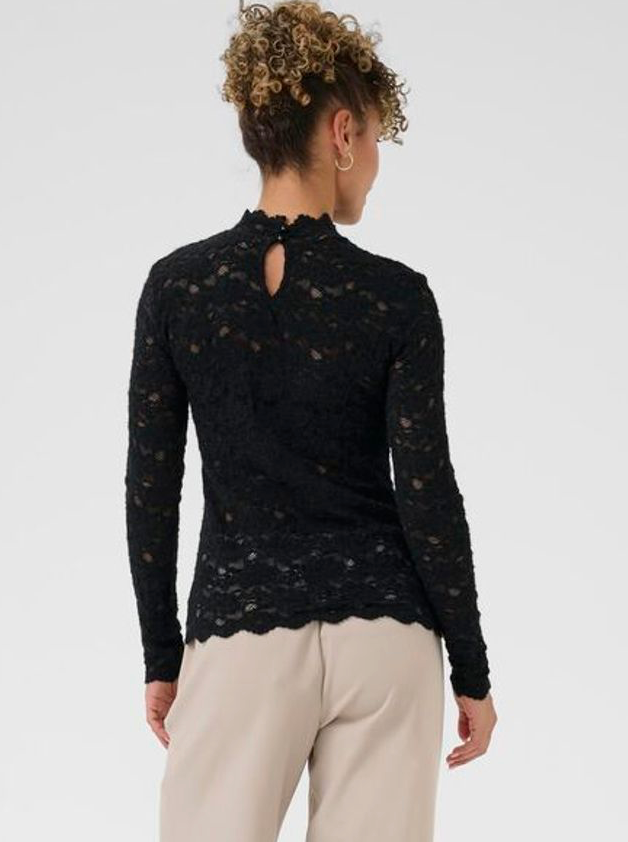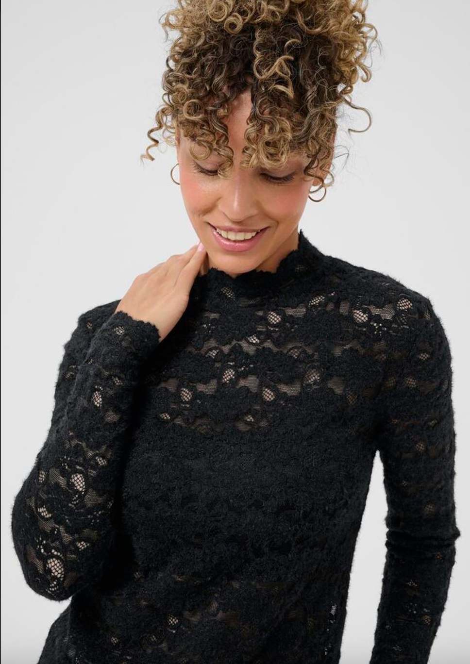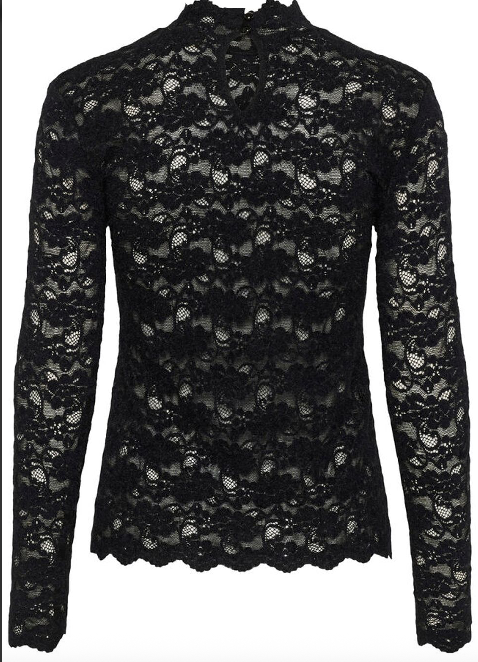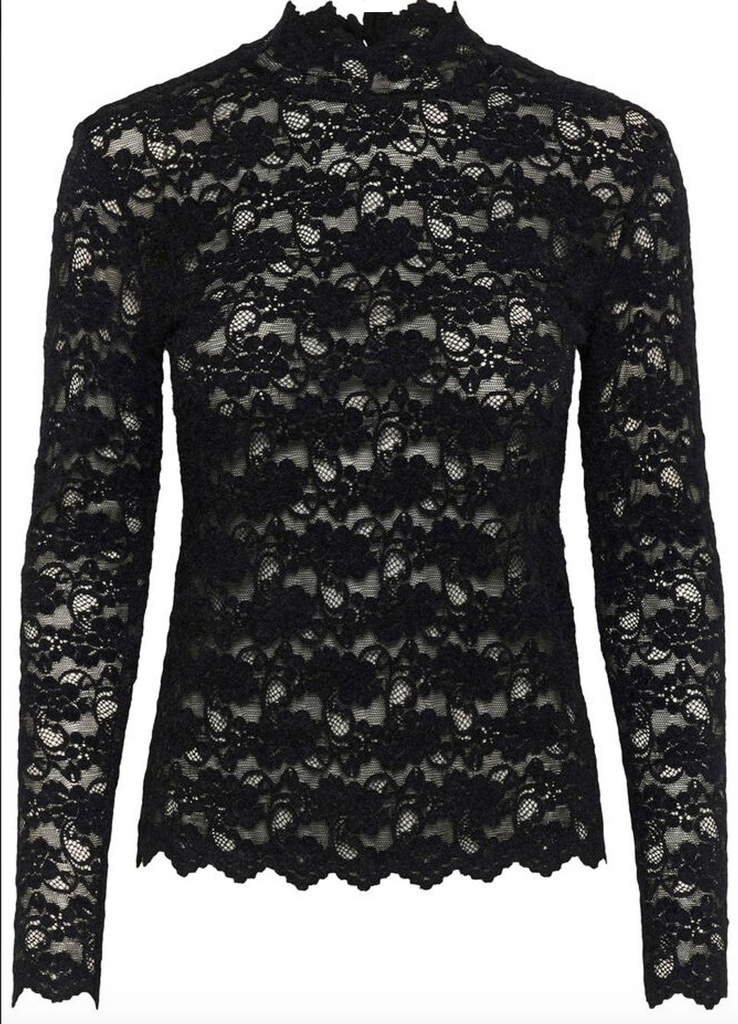 A sheer, fitted, stretch lace top in a slim fit with fitted long sleeves to hip length.