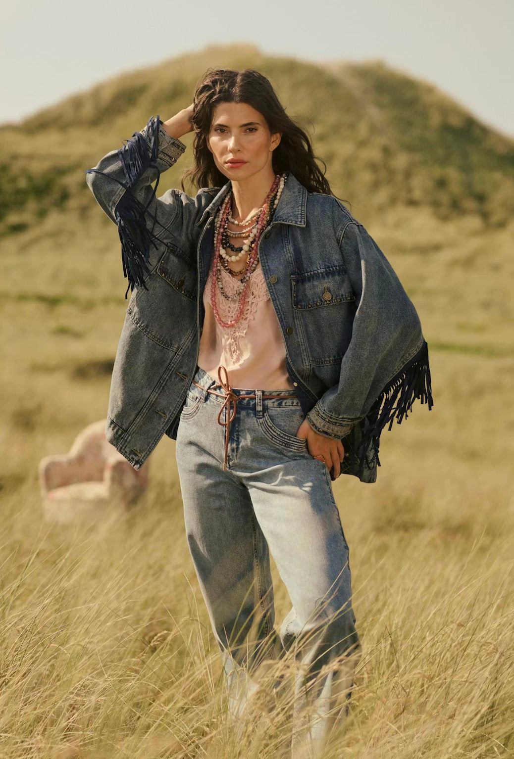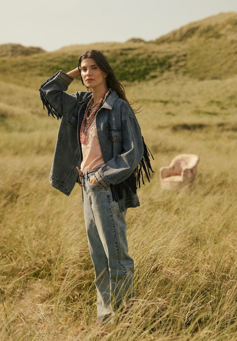This women's denim jacket features a relaxed fit, classic button-up front, chest pockets with metal accents, and statement sleeve fringe. Ideal for layering, it combines comfort and modern style for effortless everyday wear.