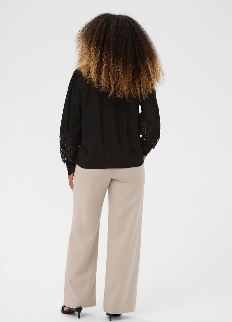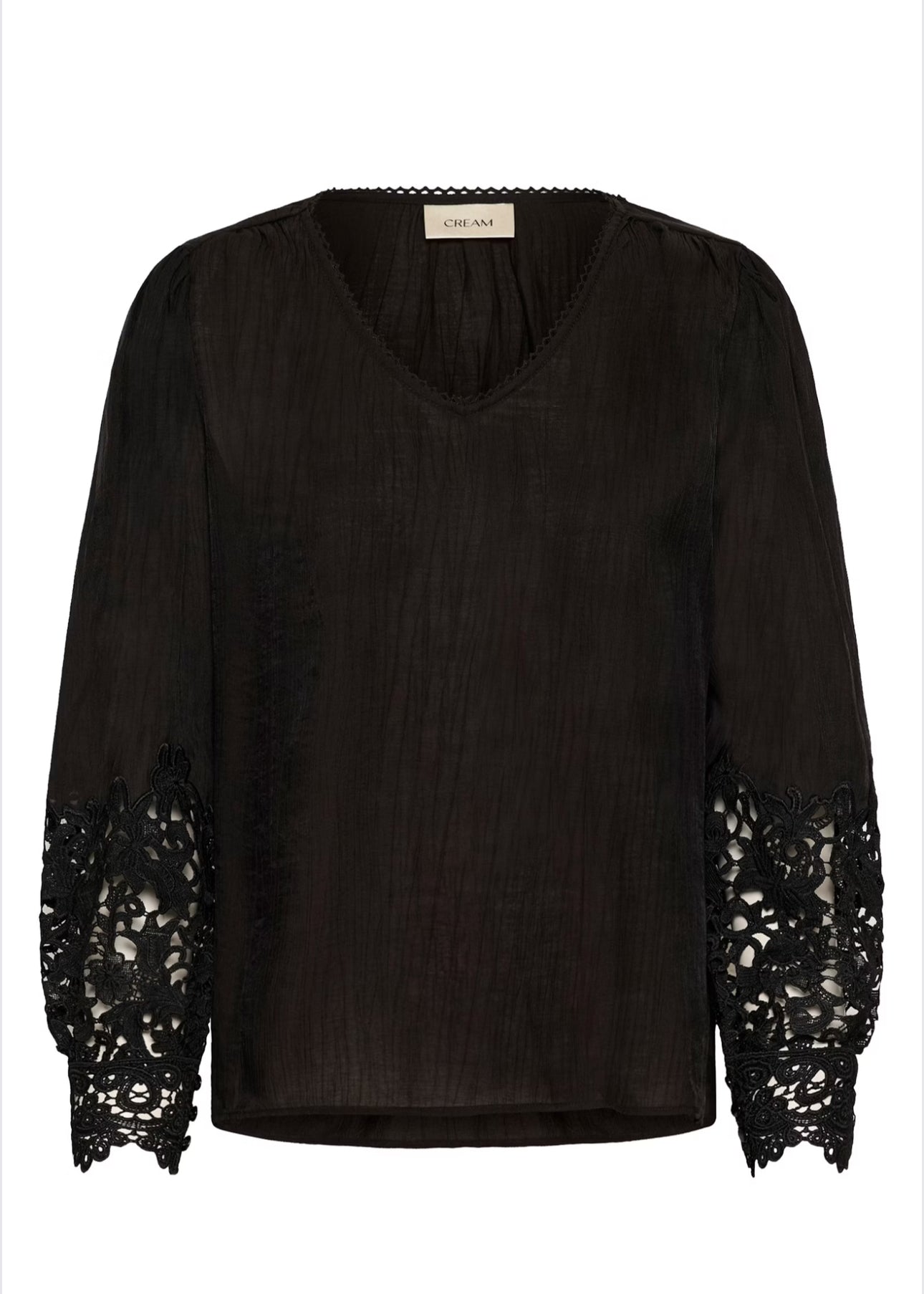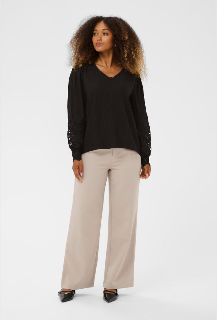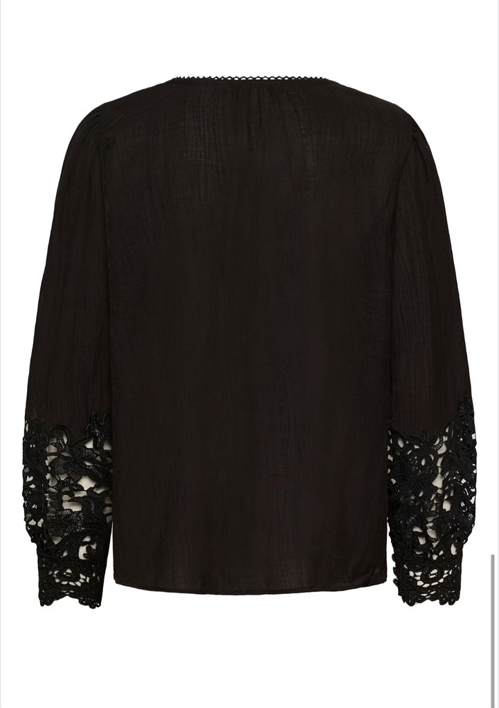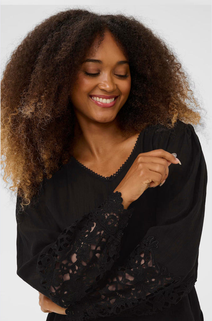 This women's blouse features a relaxed fit with a flattering V-neckline and long sleeves with intricate lace cuffs. The airy silhouette and soft fabric make it ideal for both casual and dress occasions.