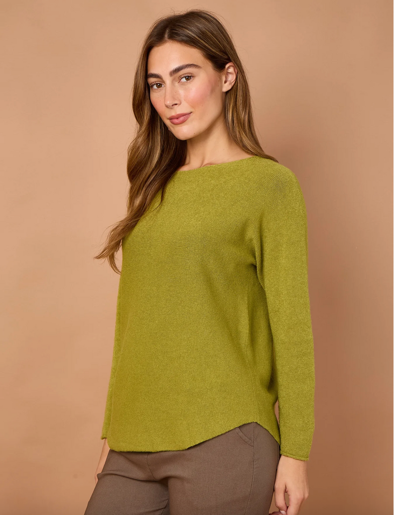 A fabulous one size piece sweater in a chunky cashmere mix. A neat cut with a cute curved hem and cuff sleeves.