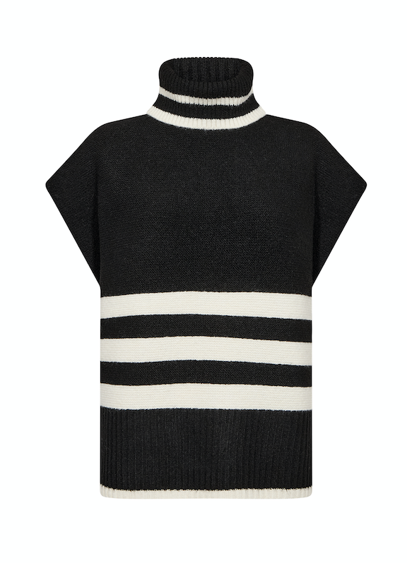 VIF 1 waistcoat is made from 65% polyester, 13% acrylic, 13% nylon, 6% wool, 3% elastane. It features a high ribbed collar, a textured knit design with stripe pattern and short sleeves. Wear is over a long-sleeve top or under a jacket for added warmth and style.