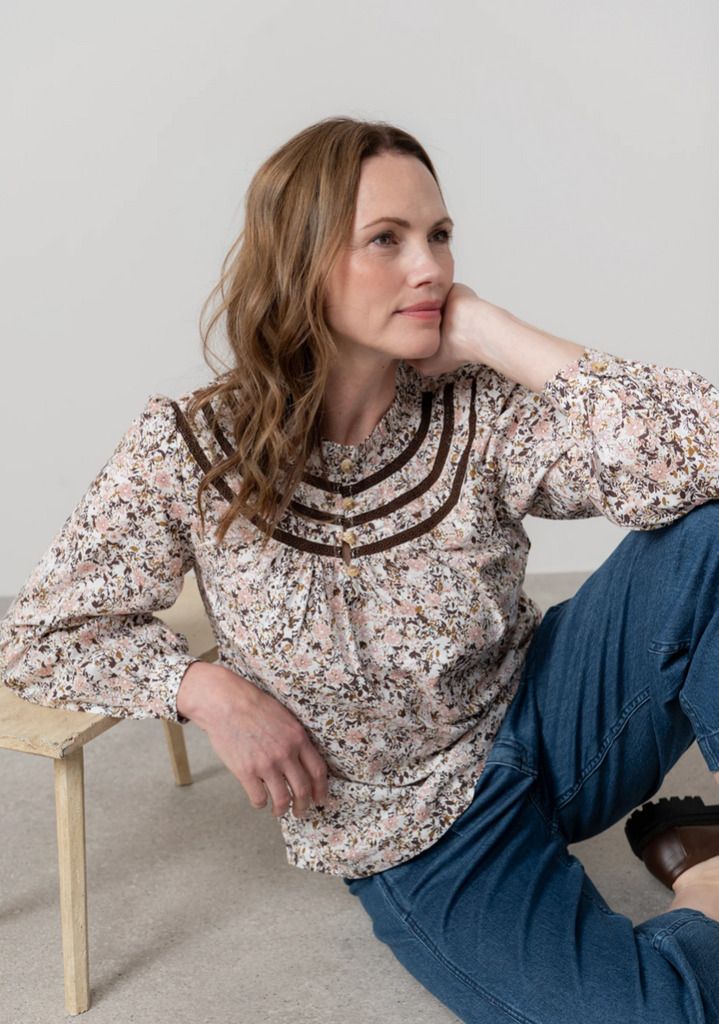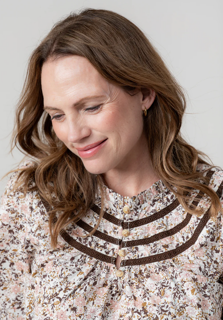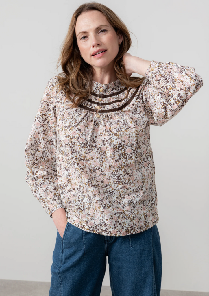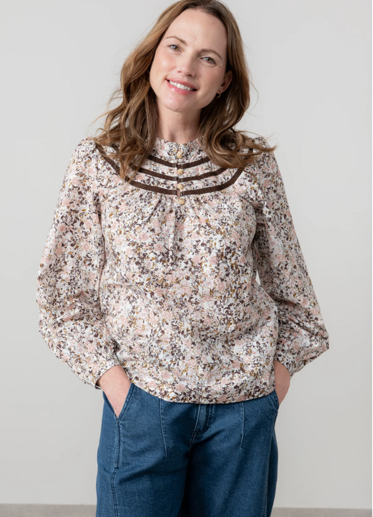 This pretty ditsy blouse is made from soft organic cotton. With a scalloped collar, buttoned neckline and cotton lace inserts at the front yoke.