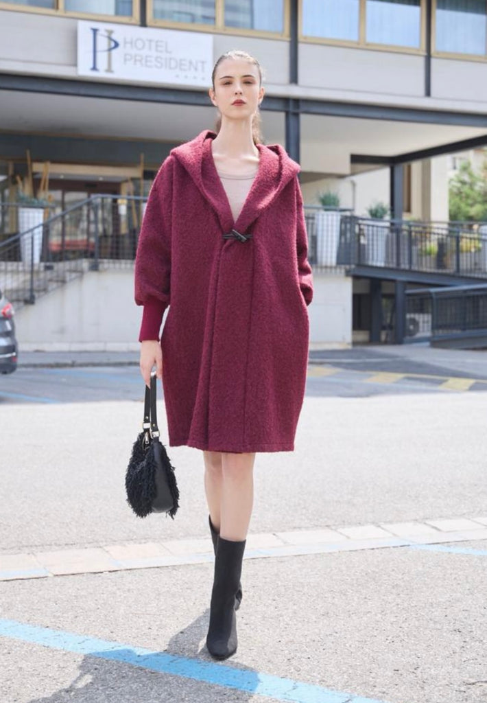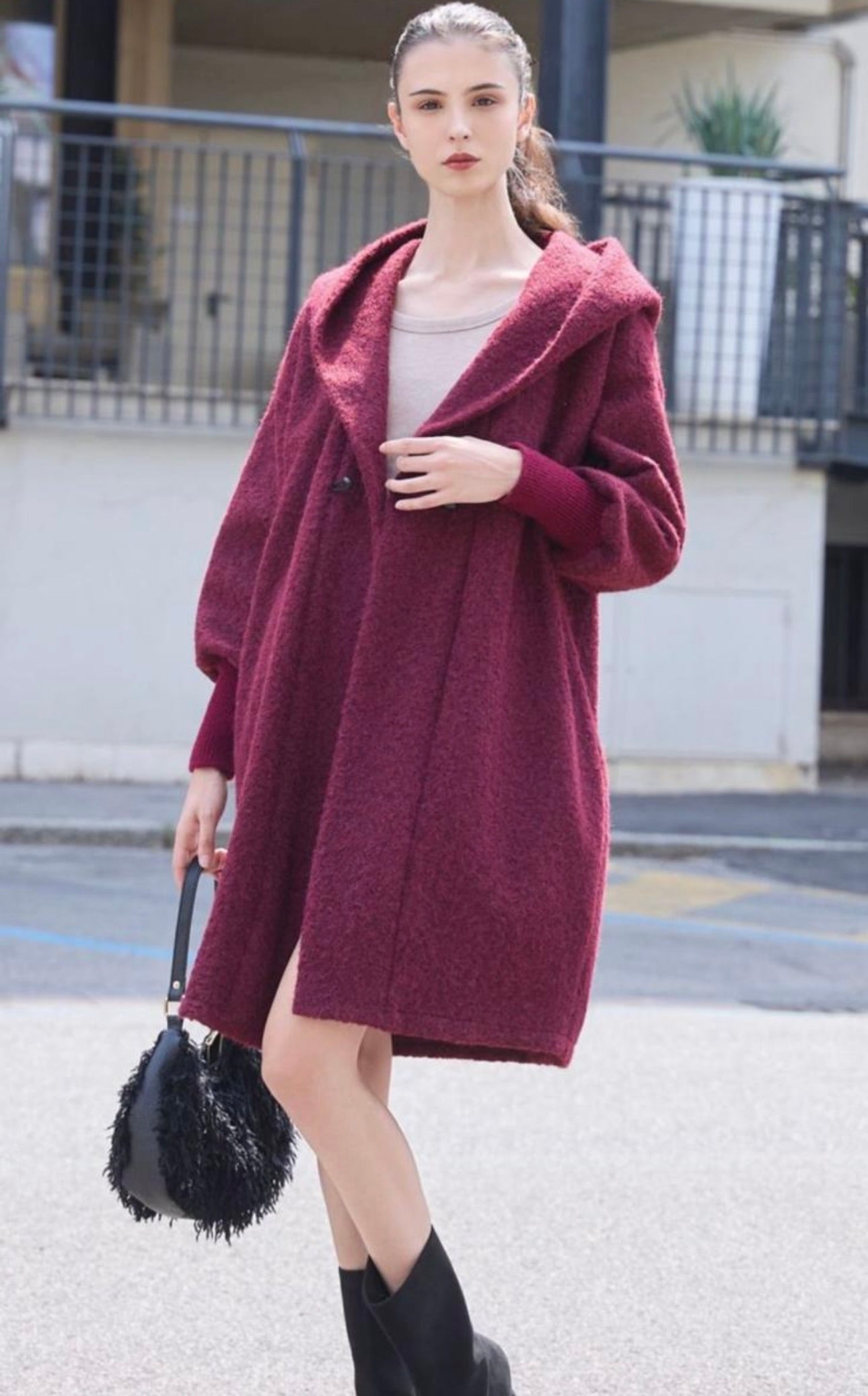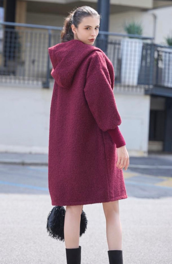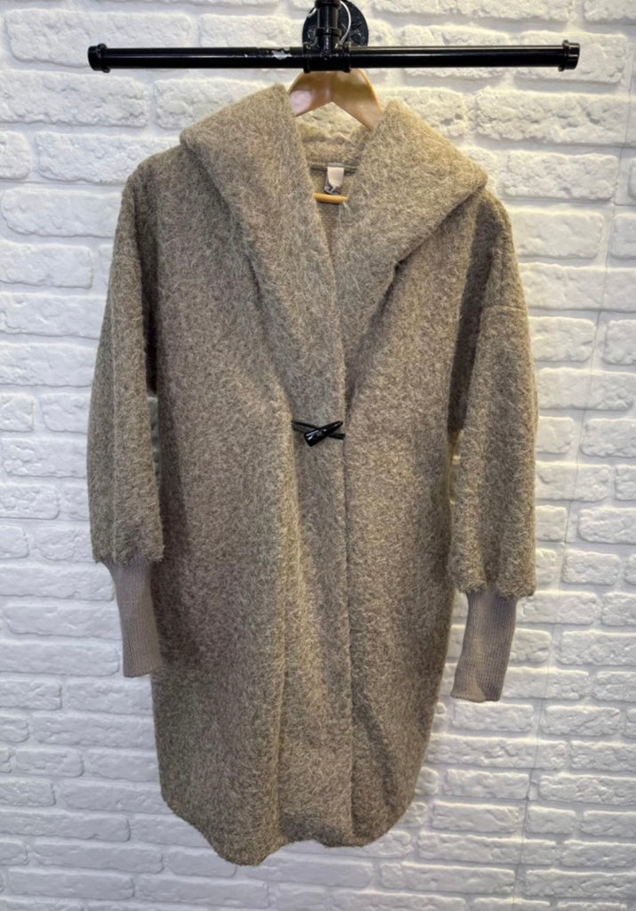 A gorgeous boucle coat with single buckle front tie and elegant wide hood. The deep elasticated cuffs and side pockets complete the look.