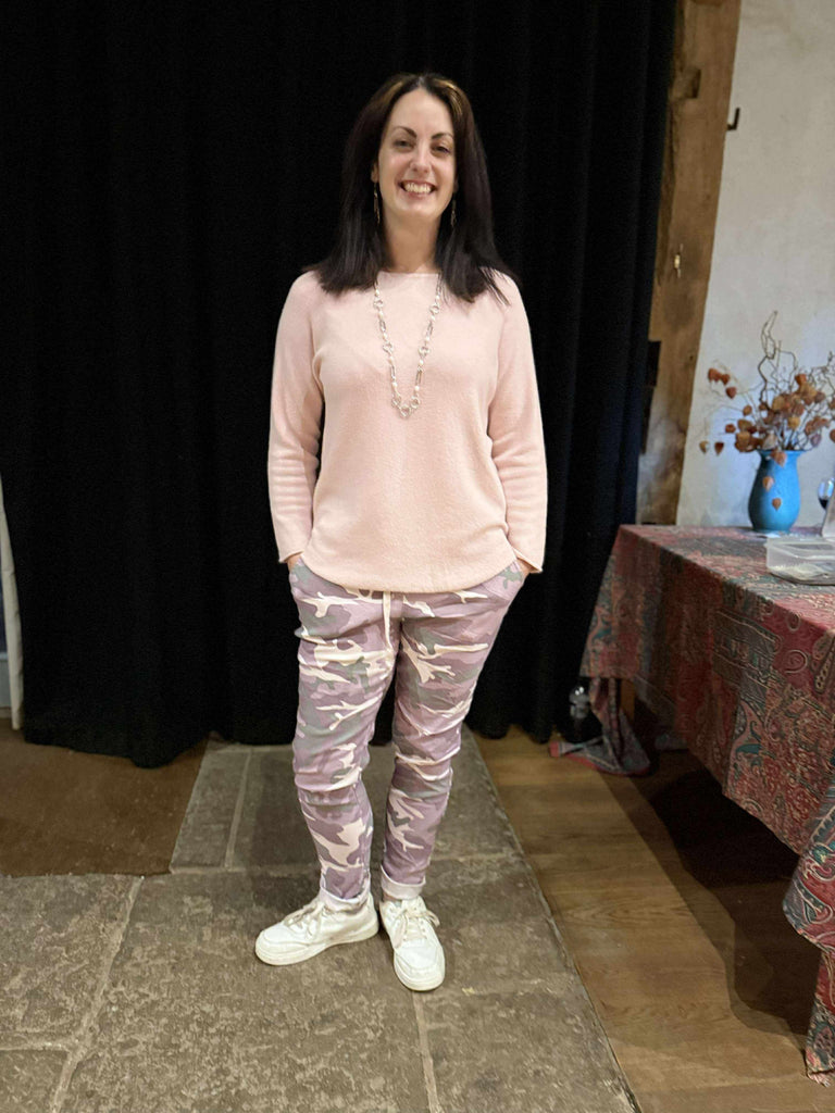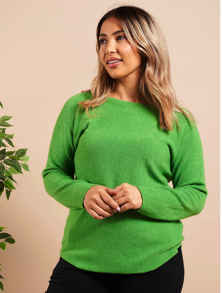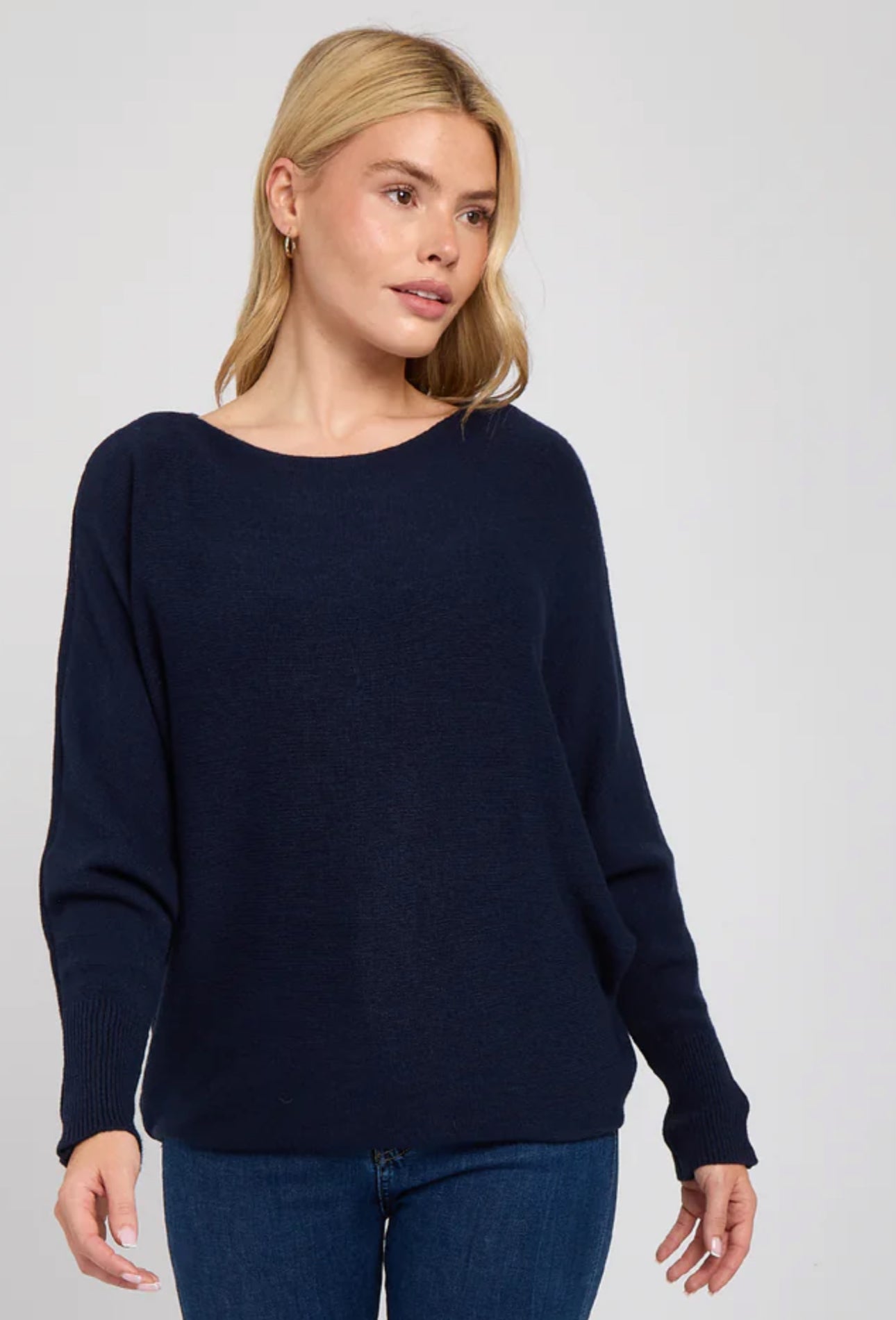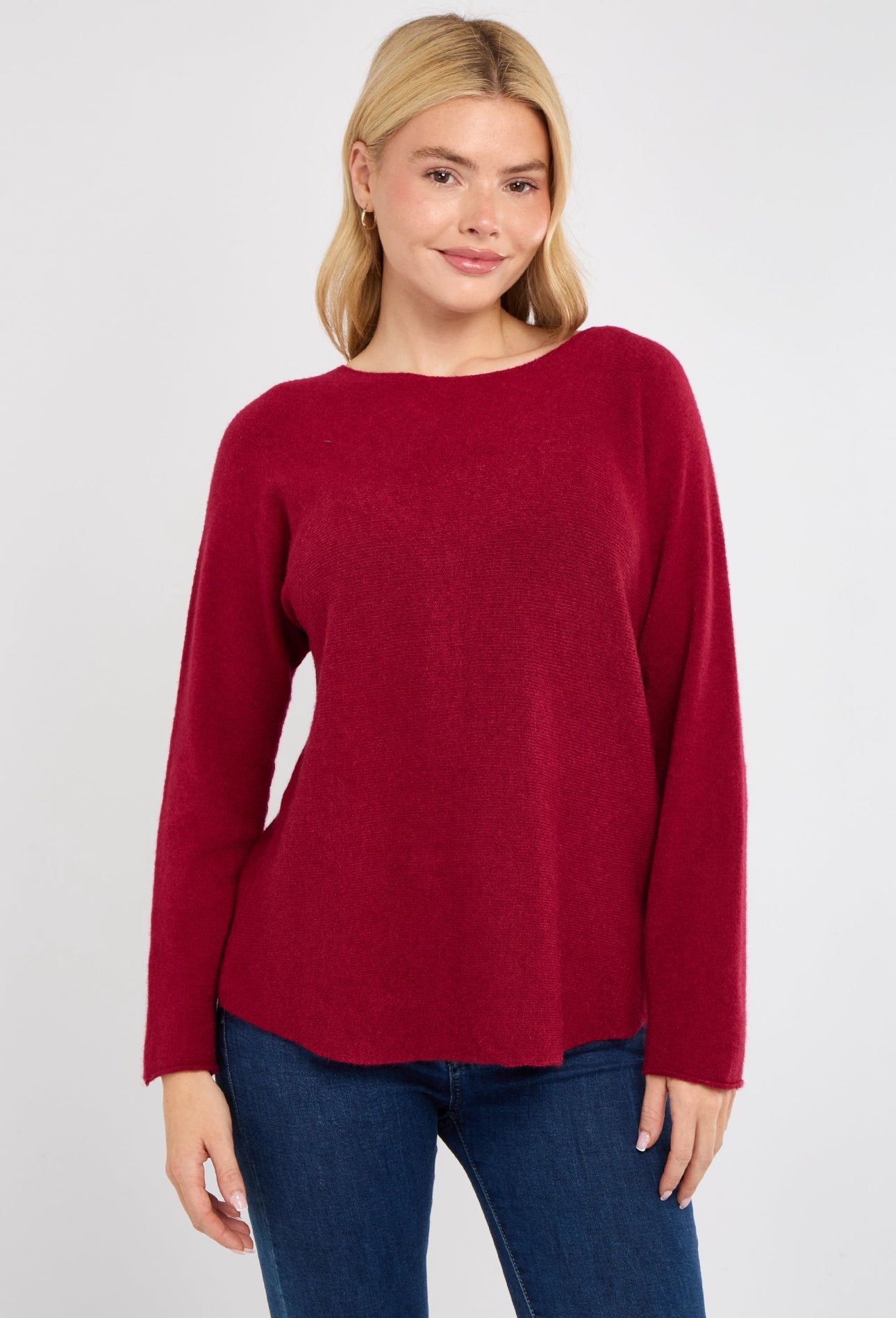 A fabulous one size piece sweater in a chunky cashmere mix. A neat cut with a cute curved hem and cuff sleeves.