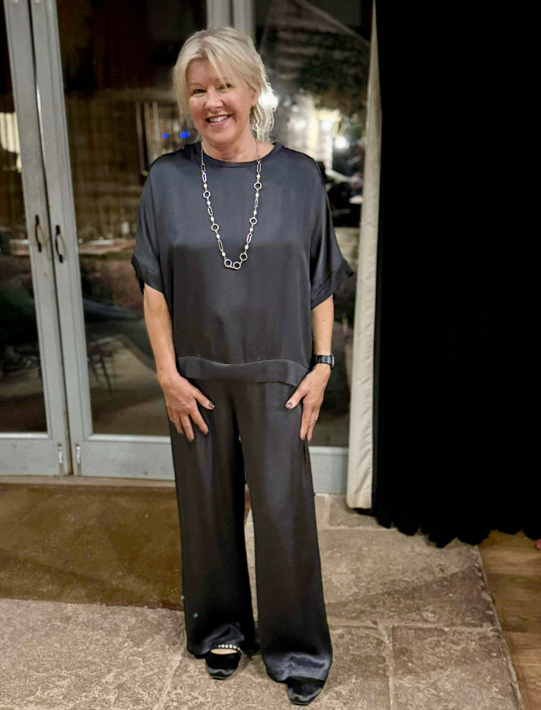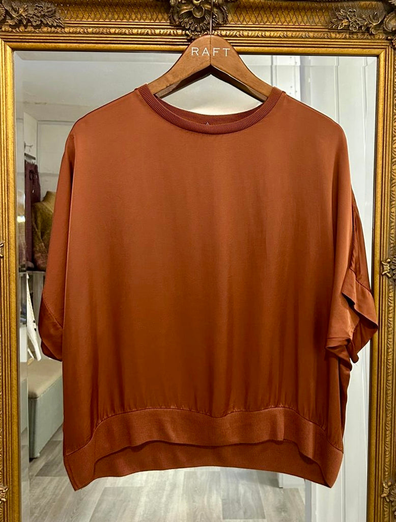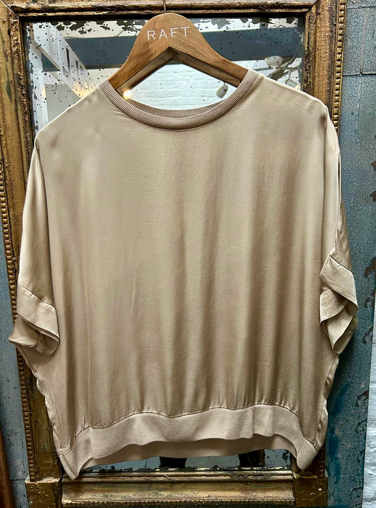 A beautiful satin top with round neck line, wide waistband and 1/2 length wide sleeves. In a box shape, this lovely top is loose and floaty and the satin finish gives a metallic, almost pewter, look.