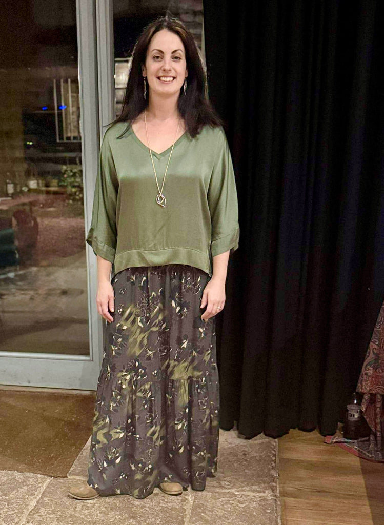 A beautiful satin top with v neck line, wide waistband and 3/4 length wide sleeves. In a box shape, this lovely top is loose and floaty and the satin finish gives a metallic, almost pewter, look.