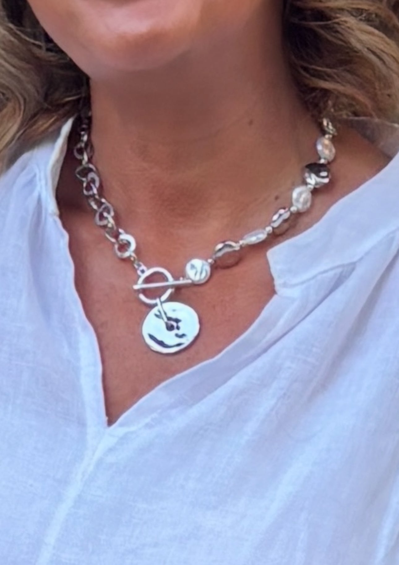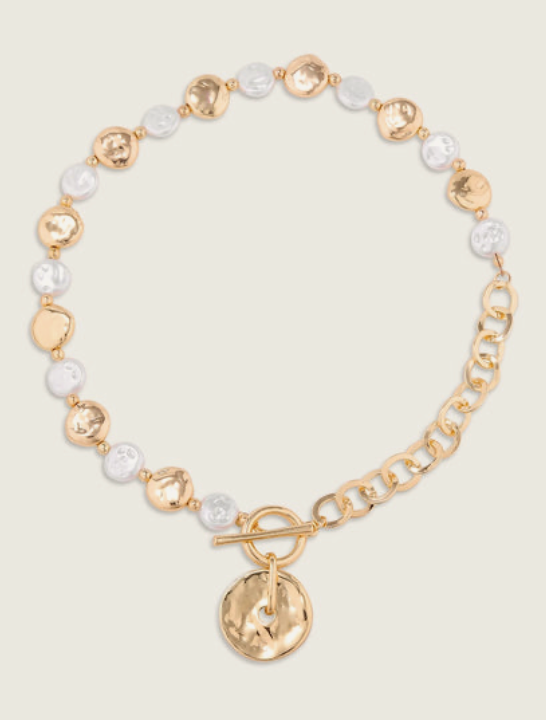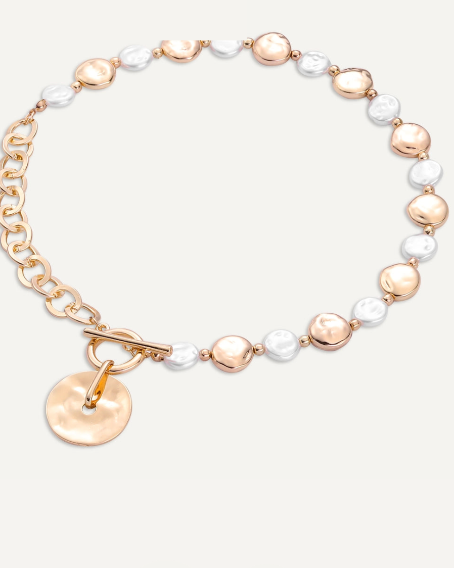 Pearl Disc Necklace with Toggle Clasp In Gold Tone