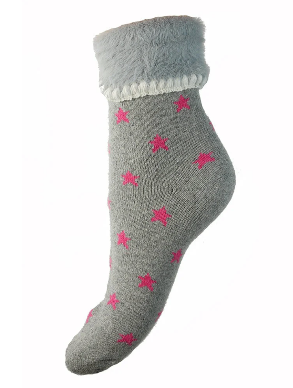 Snuggle up in our soft and cozy grey cuff socks with stars and a faux fur cuff! These stylish socks will keep your feet deliciously warm and comfy all day and night. Easy-care instructions: simply machine wash at 40 degrees, and they'll be good as new!