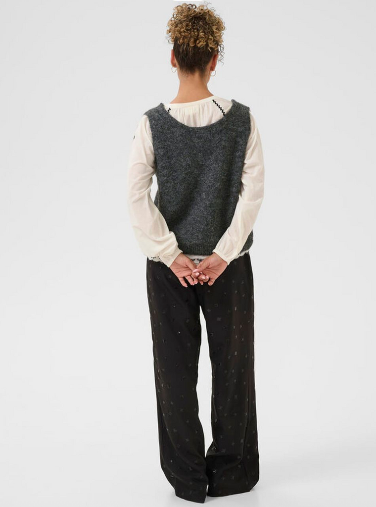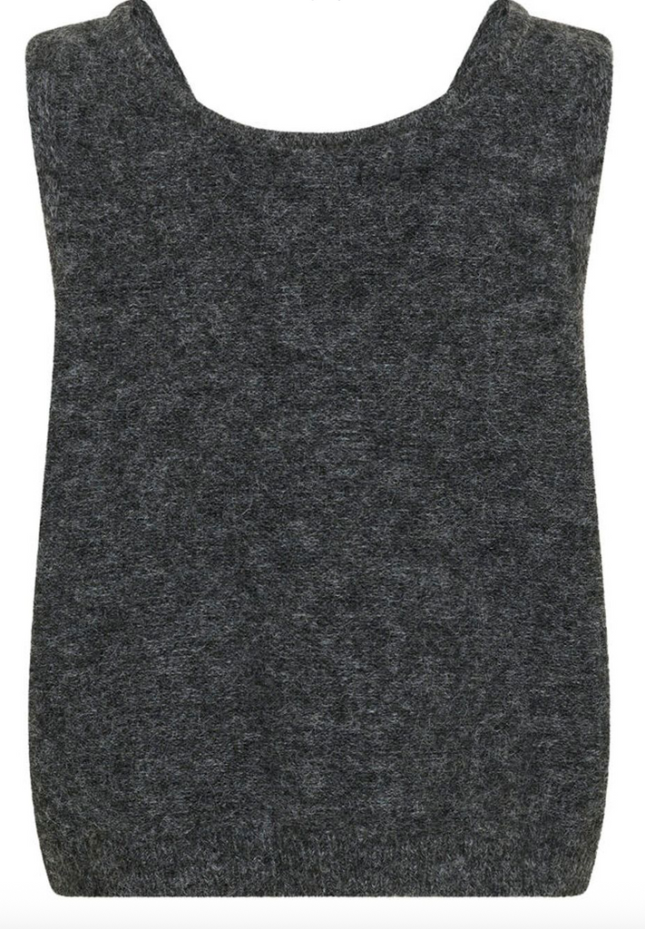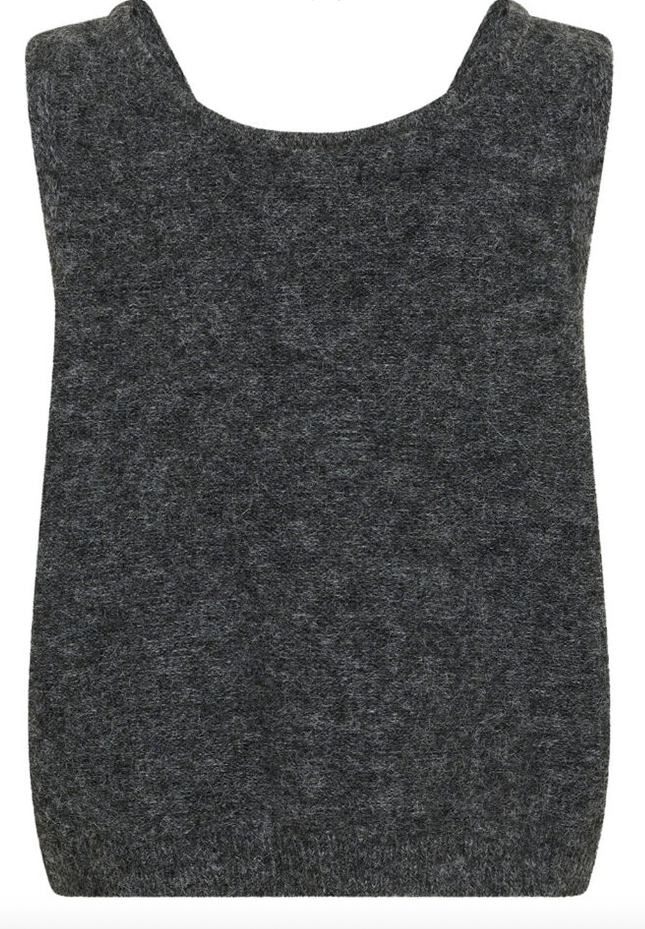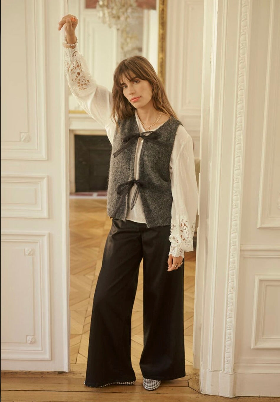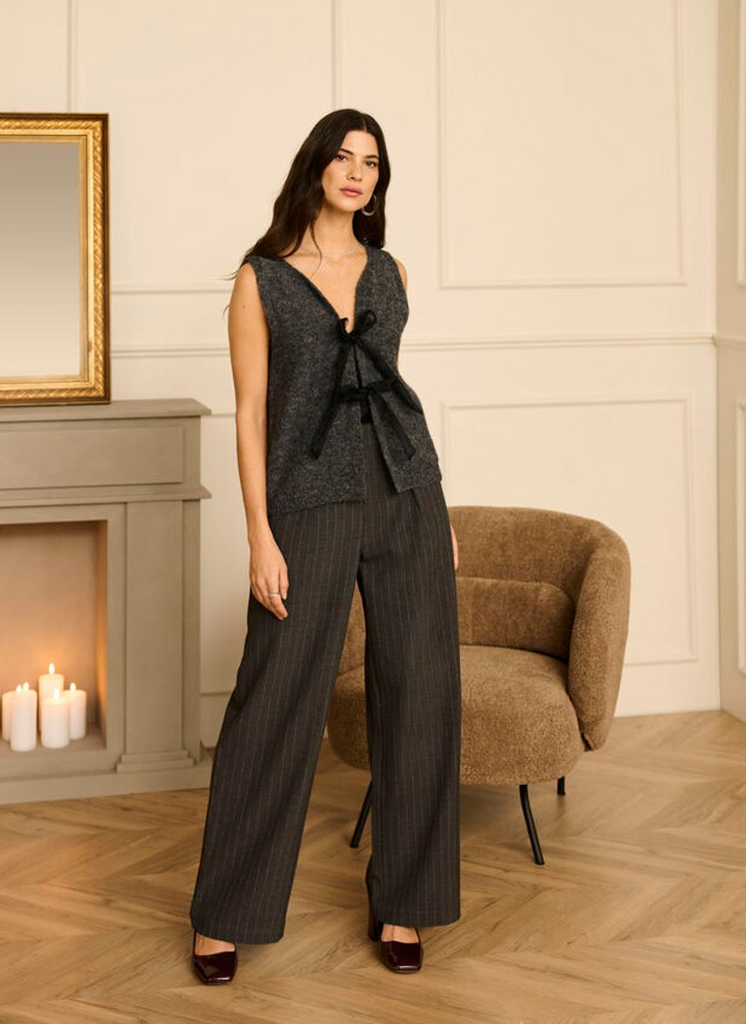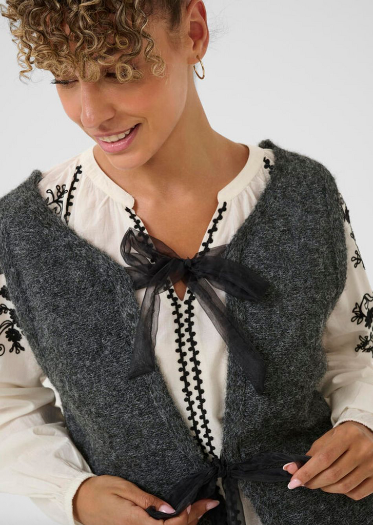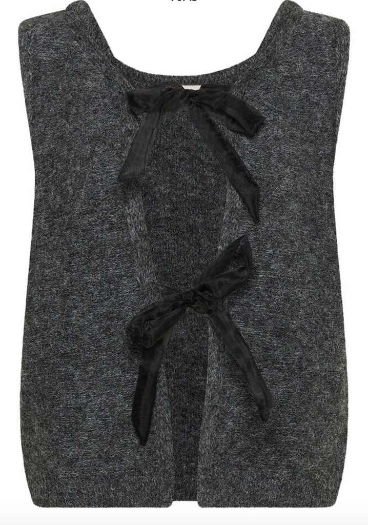 Sleeveless vest with a straight silhouette and open front, featuring two prominent bow tie closures. The texture appears soft and slightly fuzzy, adding depth to the overall look while maintaining a simple style with clean edges.