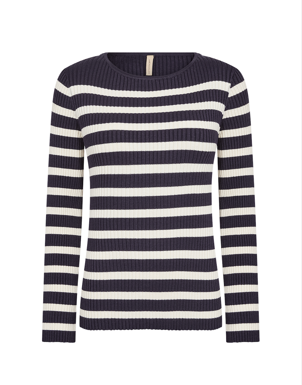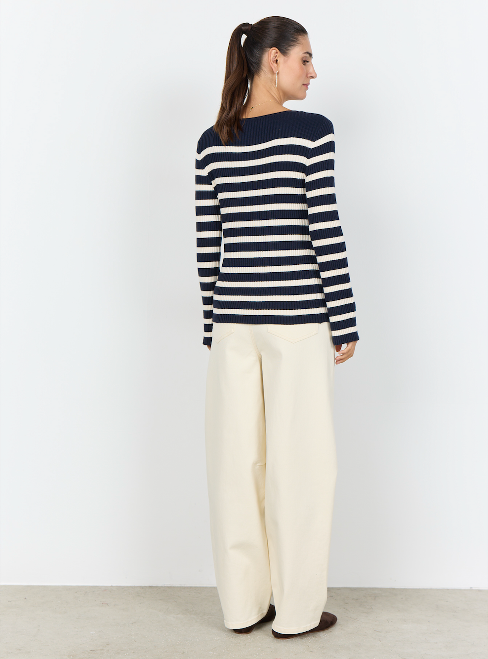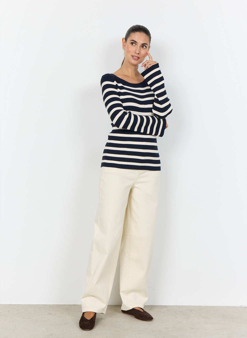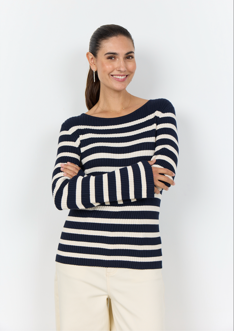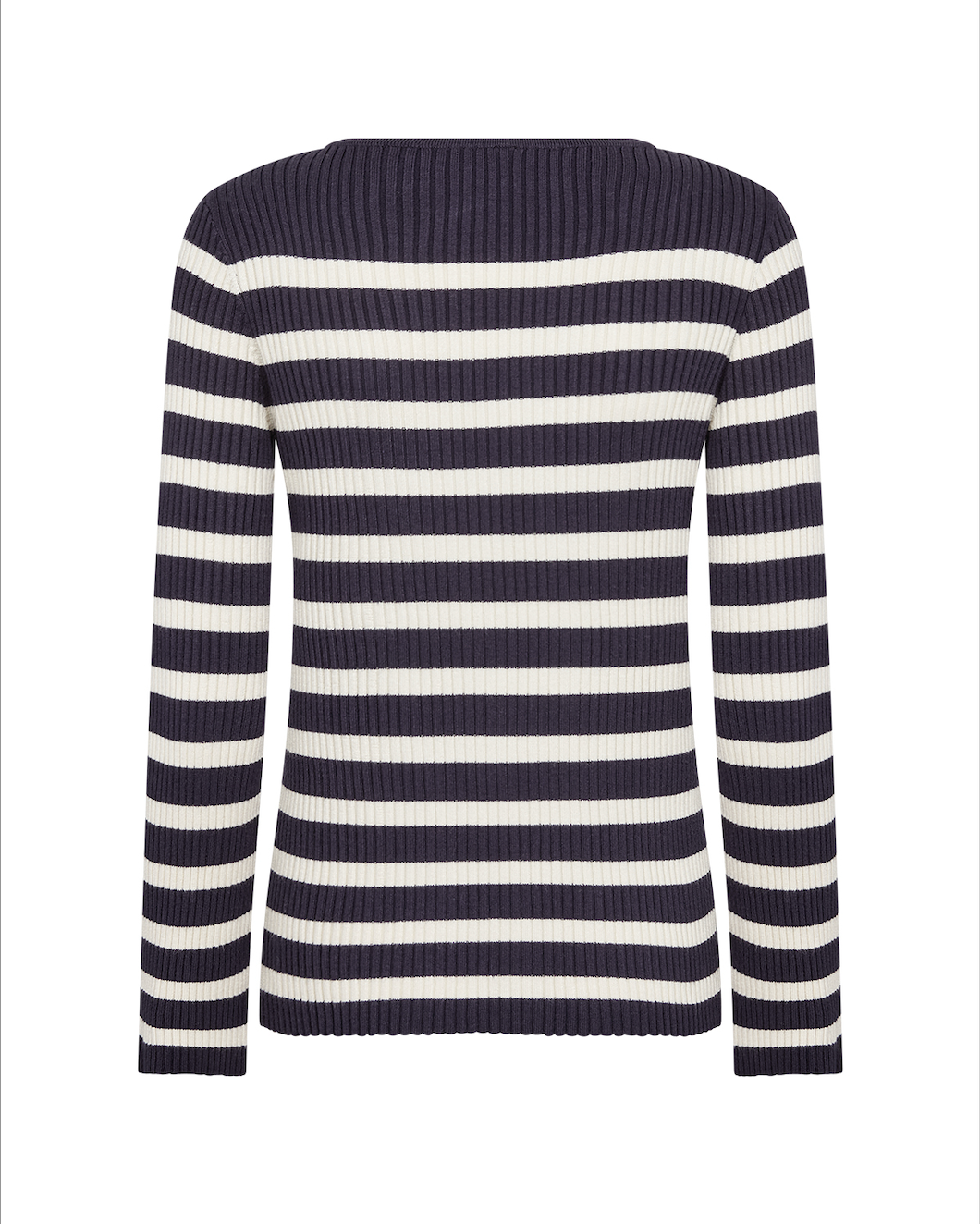 DOLLIE 813 is a Pullover crafted from 75% Viscose and 25% Nylon. This pullover features a ribbed texture, straight hem, and a timeless striped print for a casual look. Pair it with tailored trousers or denim for an elegant and cool style.