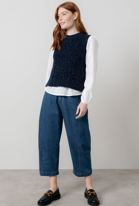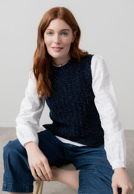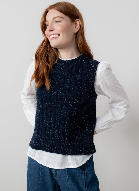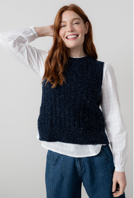 The Eva is a cotton-rich knitted tank in a variety of colourways. Woven from a flecked ‘neppy’ yarn giving it a beautifully soft level of colour.