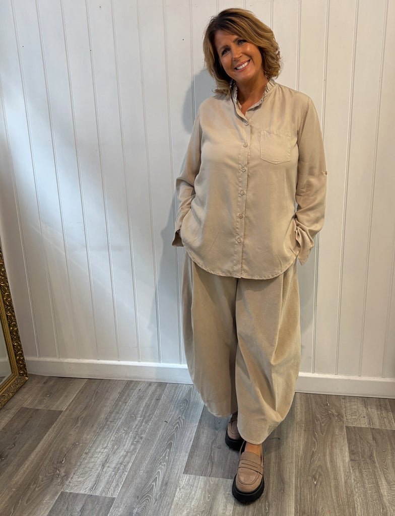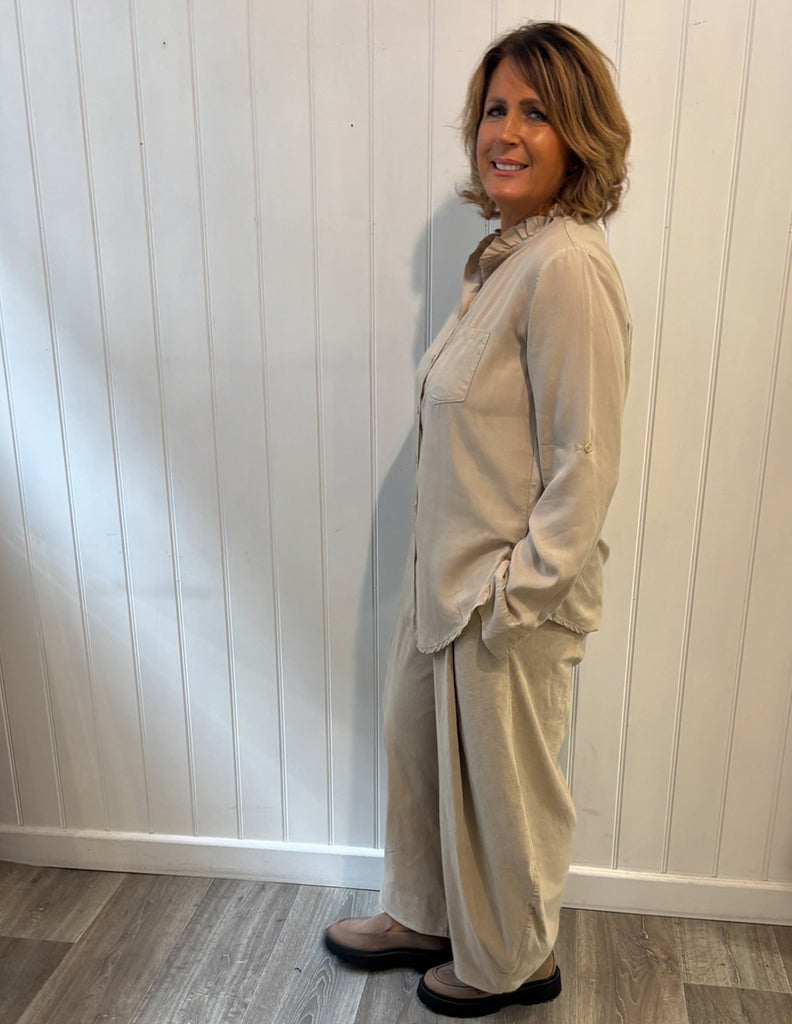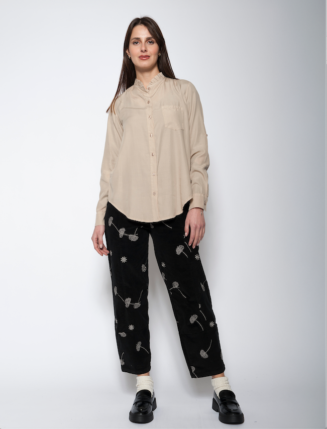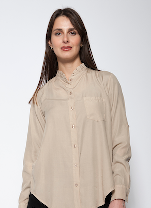A beautiful light silky shirt with frill collar, grandad shirt shaped hemline and delicate mother of pearl button down front and cuffs. A patch breast pocket completes the look.