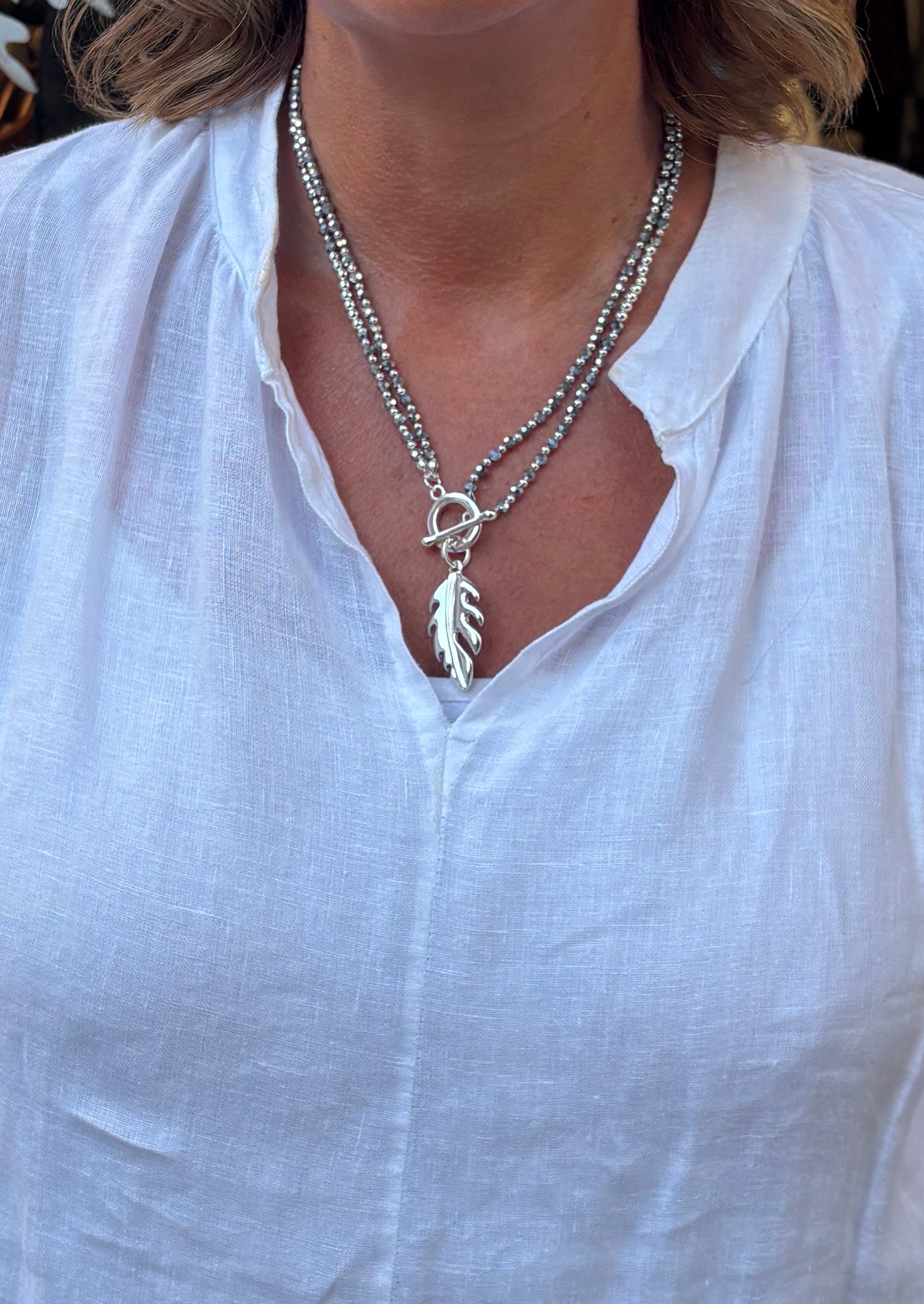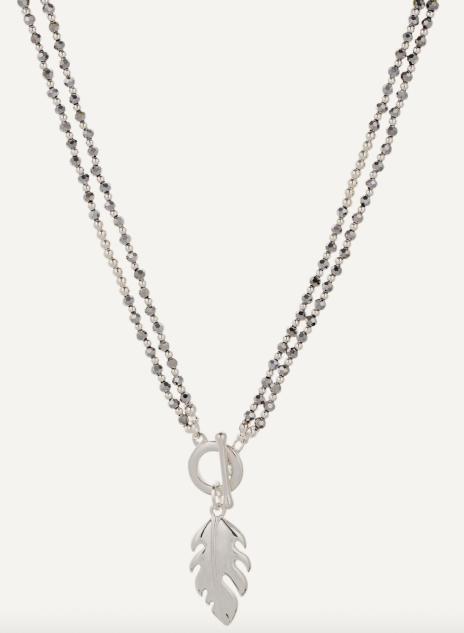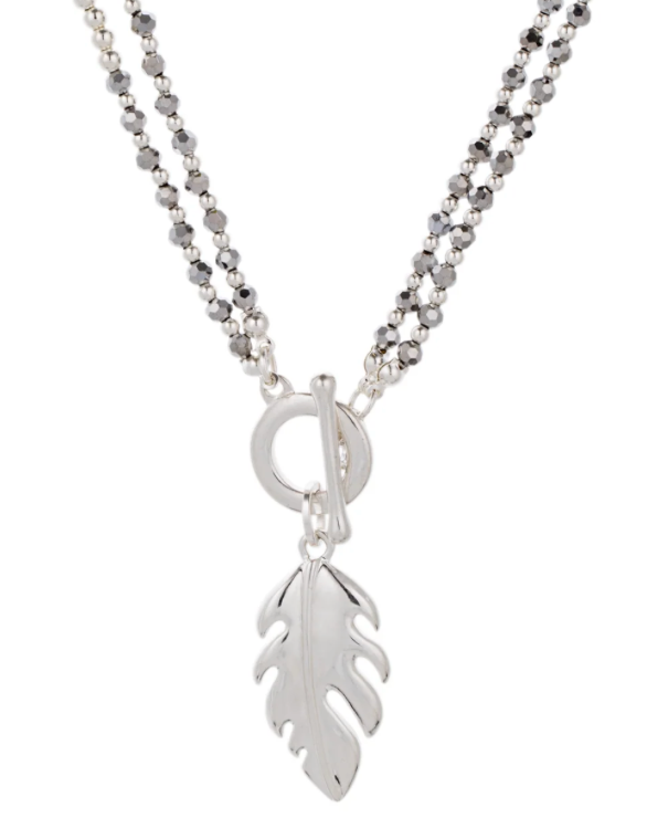 Designed with a long crystal hematite and silver ball chain with a T-bar fastener suspending a stunning polished silver leaf pendant below. Can be worn with T bar and double chain as a short necklace or opened up with just the T bar Loop and Leaf on a single long chain.