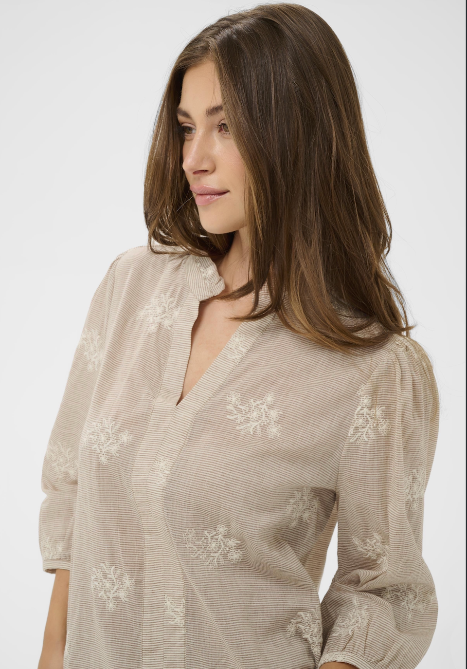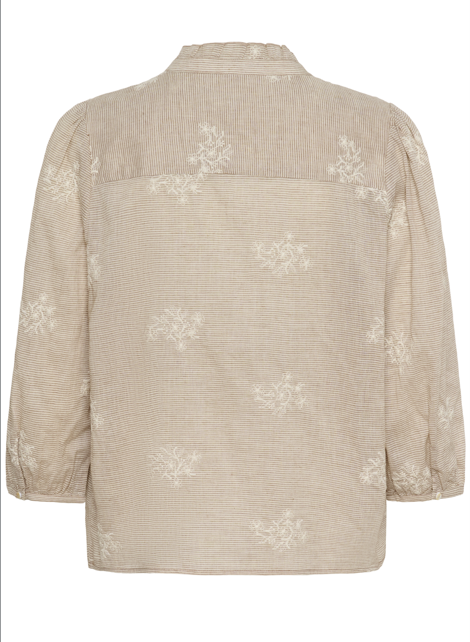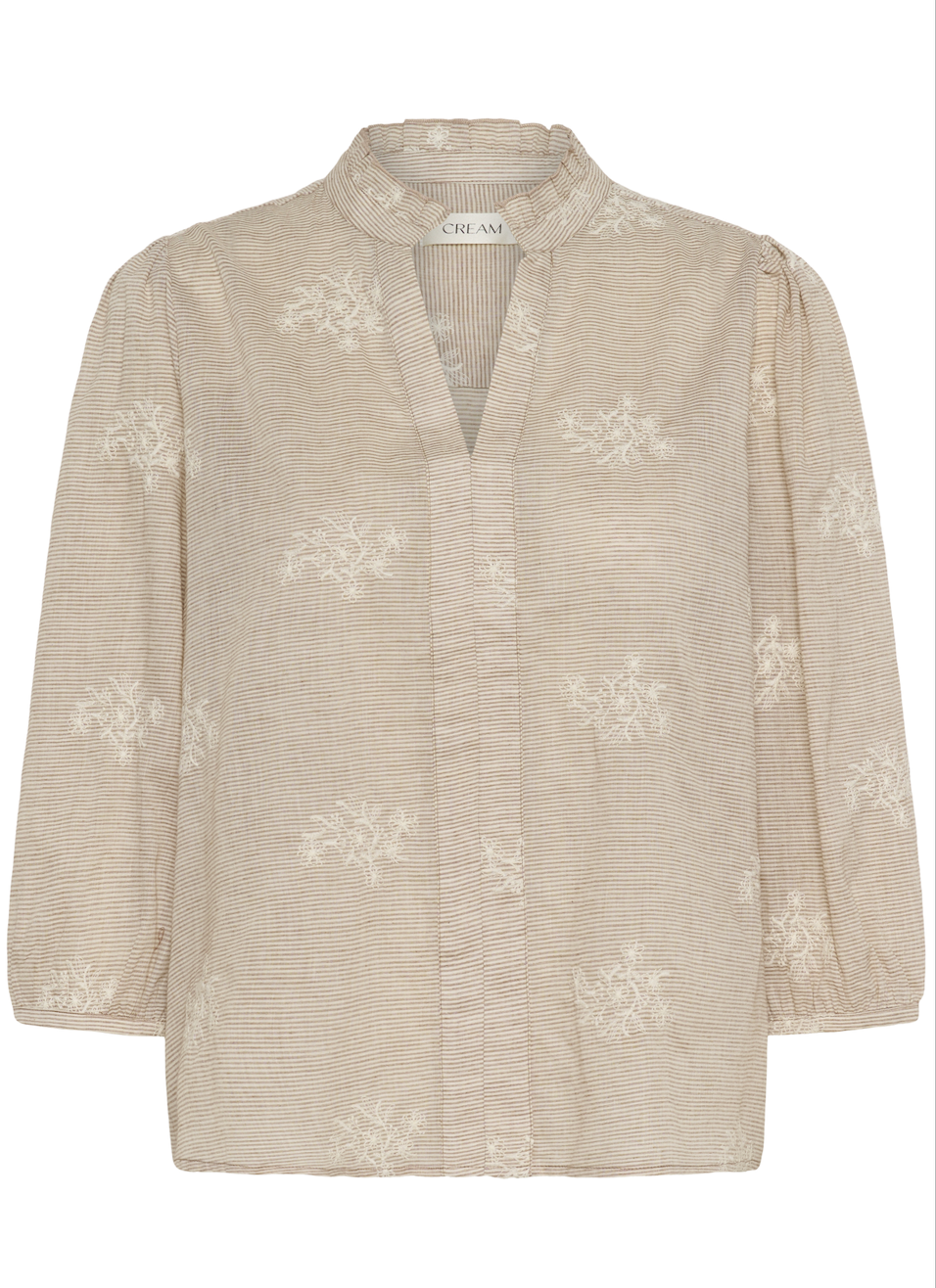 Stunning cotton notch neck blouse in horizontal pinstripe in light caramel and chalk, exquisitely decorated with chalk floral embroidery. A beautiful frill edged mandarin collar opens to the placket notch neck and this lovely light-weight shirt is finished off with 3/4 length puff sleeves edged with narrow cuff and delicate mother of pearl button fastener.