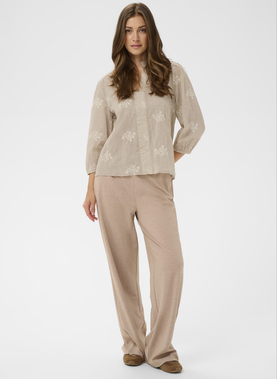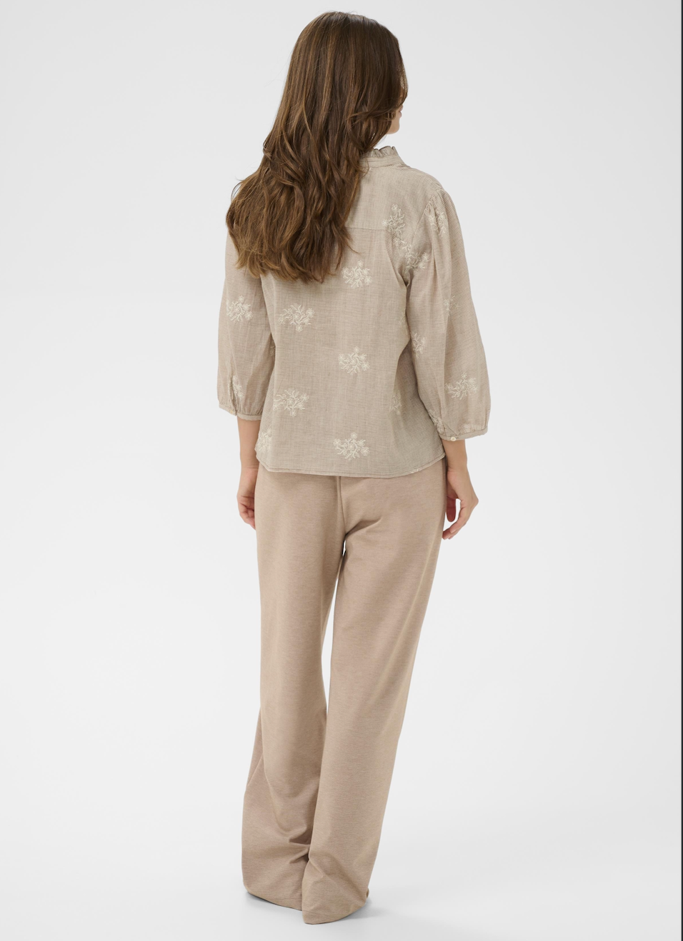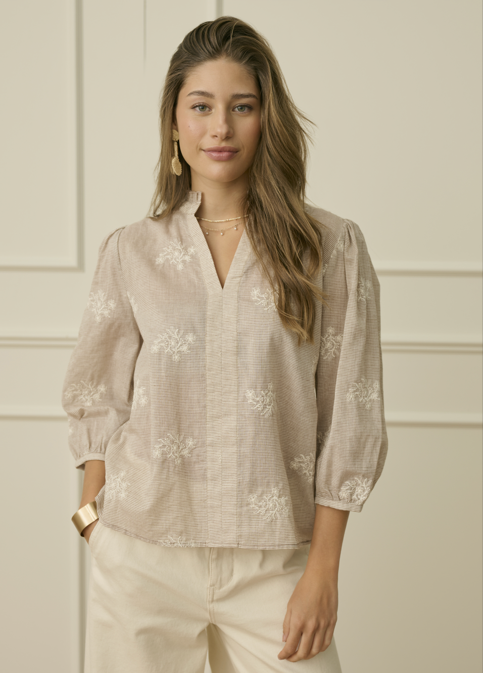Stunning cotton notch neck blouse in horizontal pinstripe in light caramel and chalk, exquisitely decorated with chalk floral embroidery. A beautiful frill edged mandarin collar opens to the placket notch neck and this lovely light-weight shirt is finished off with 3/4 length puff sleeves edged with narrow cuff and delicate mother of pearl button fastener.