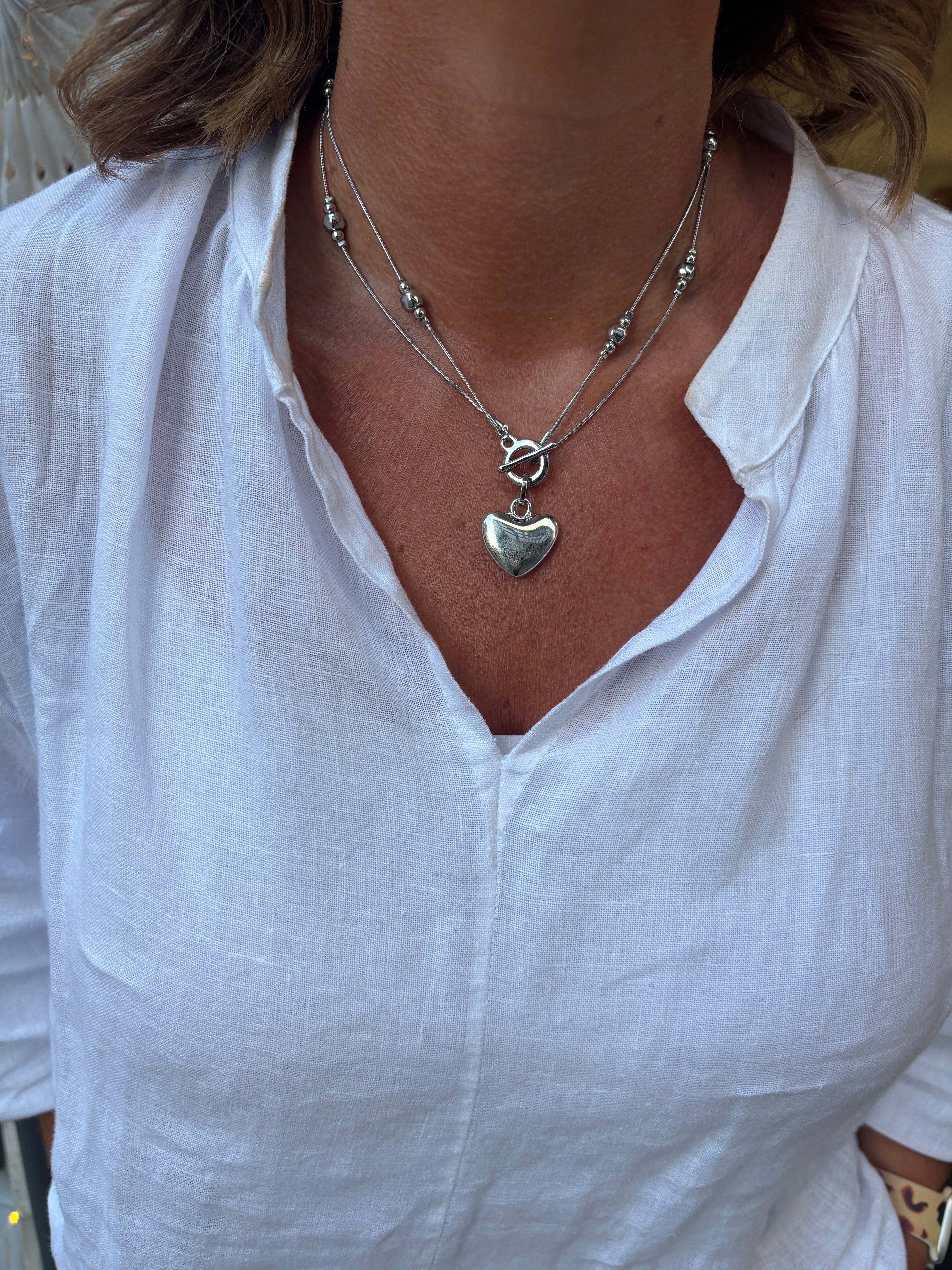 Designed with multiple chains in varying textures and thicknesses, this piece exudes sophistication. The charming silver heart pendant adds a touch of romance, making it an ideal accessory for both casual and formal occasions.