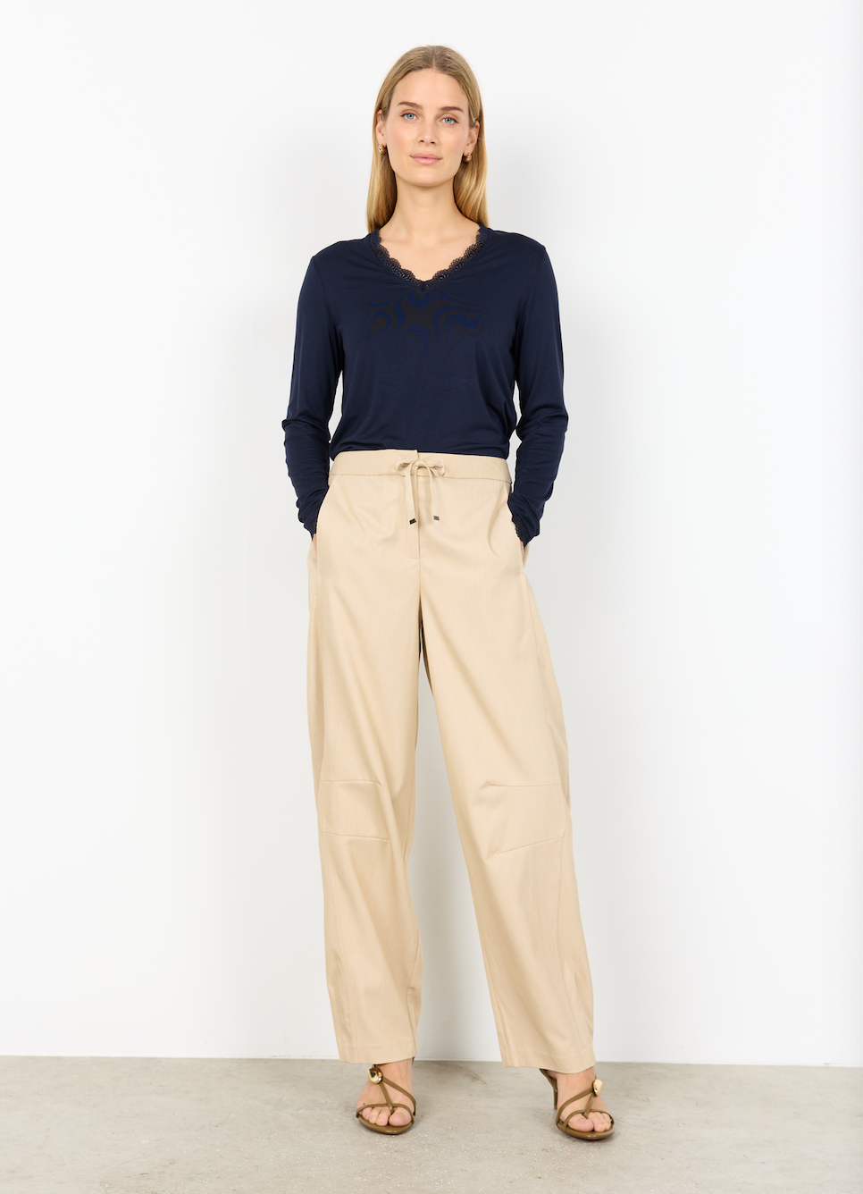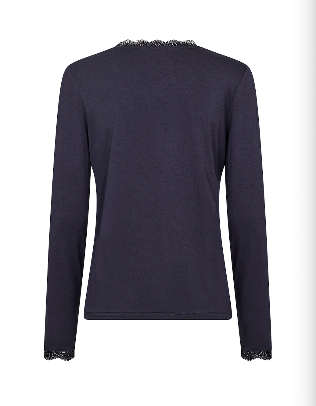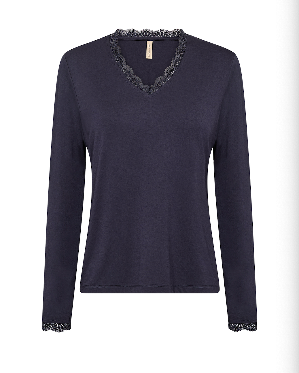 MARICA 346 is a T-shirt made from 93% Lyocell and 7% Elastane. It features delicate lace trim on the V-neck and cuffs, adding an elegant touch. Pair it with tailored trousers for a sophisticated look or jeans for a more casual vibe.