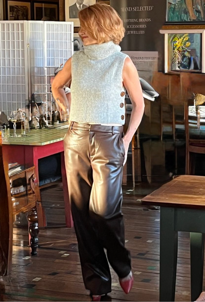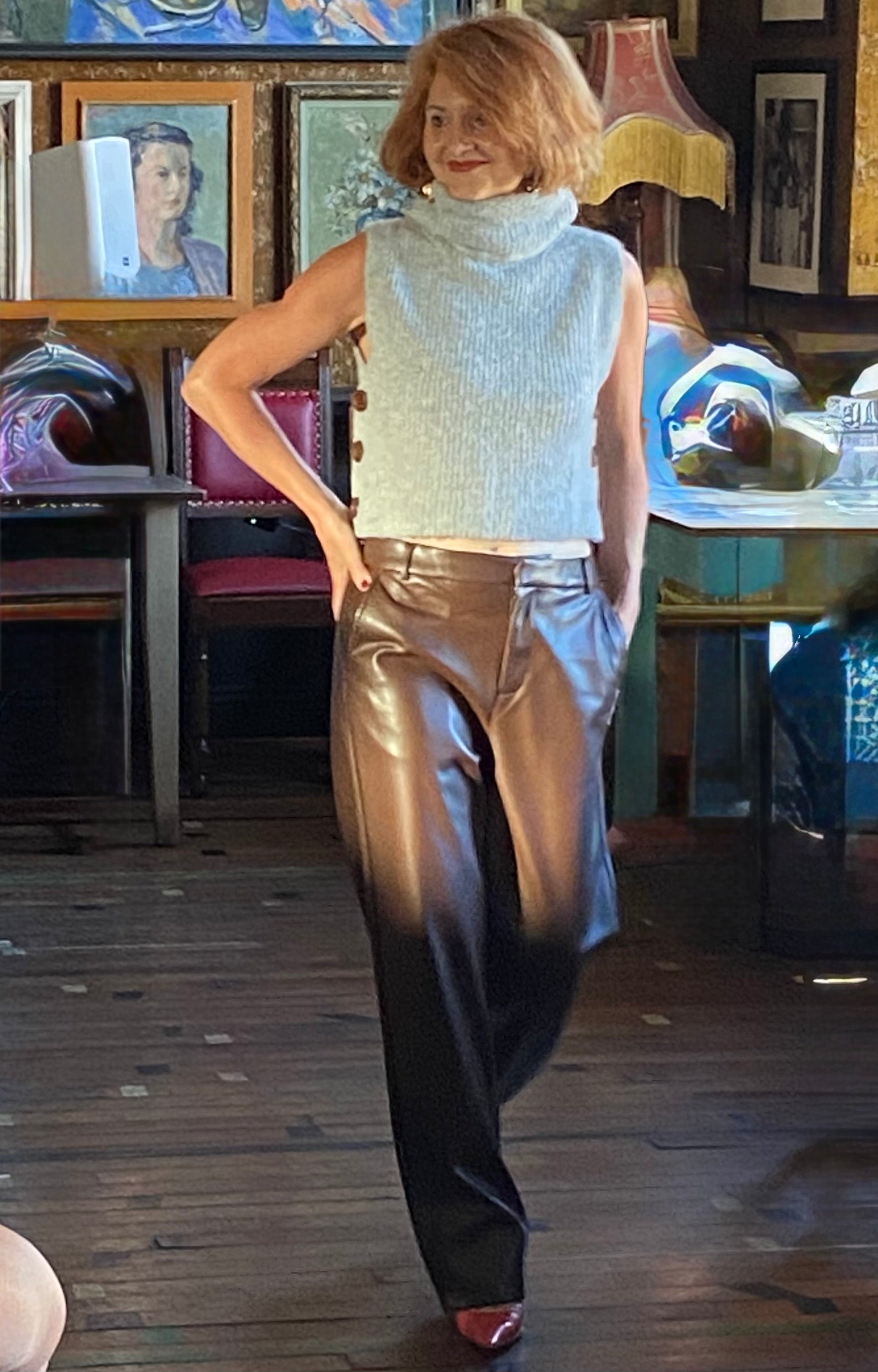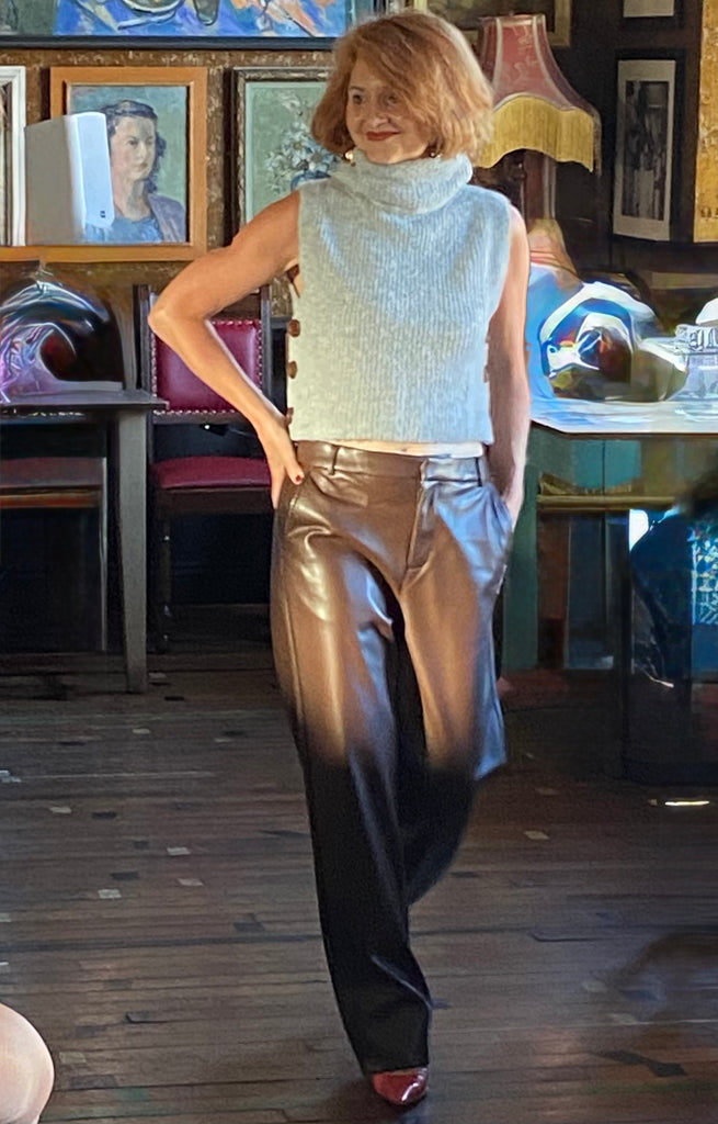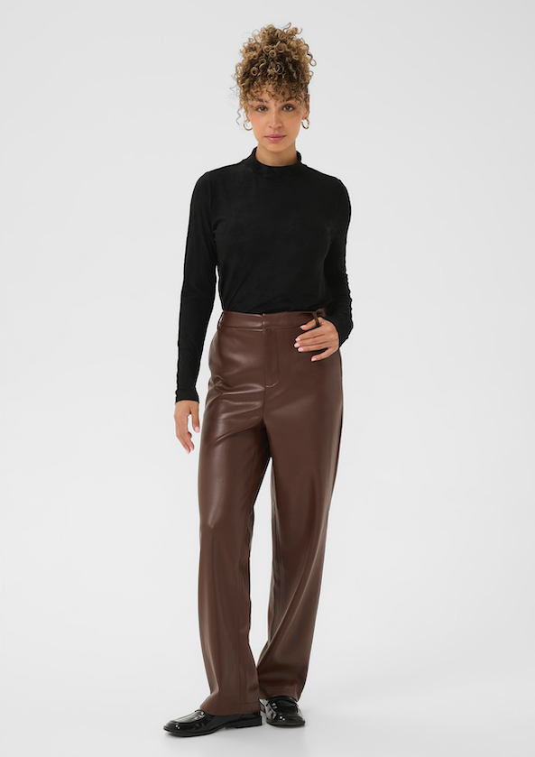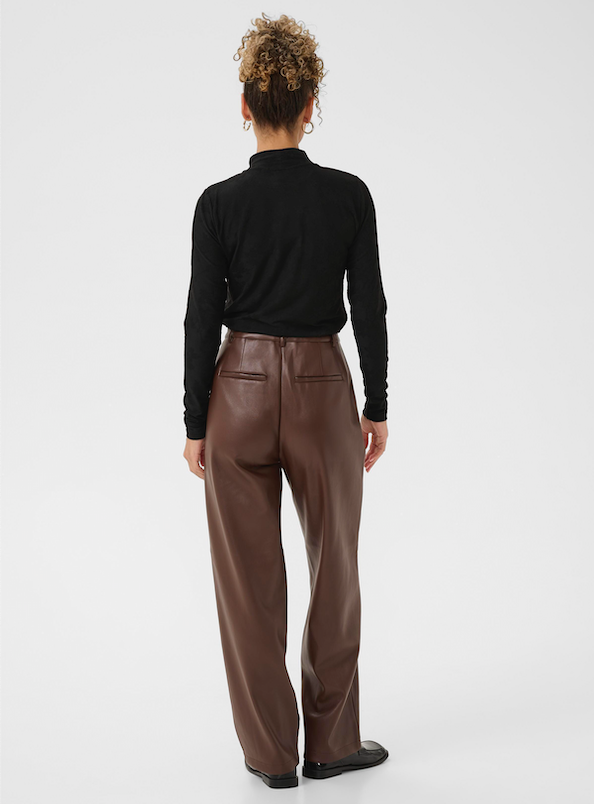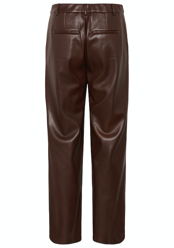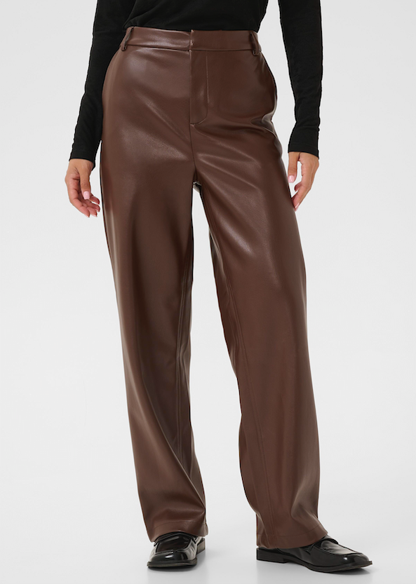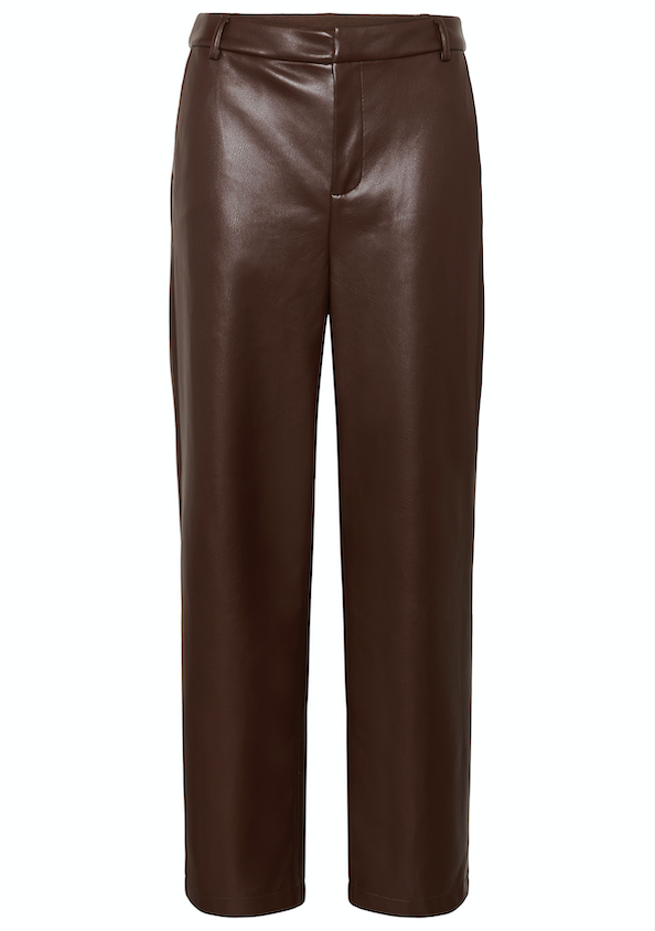 These straight-leg faux leather pants feature a sleek, smooth finish and structured silhouette with a classic waistband and belt loops. Clean lines and a tailored cut offer a contemporary edge to any outfit.