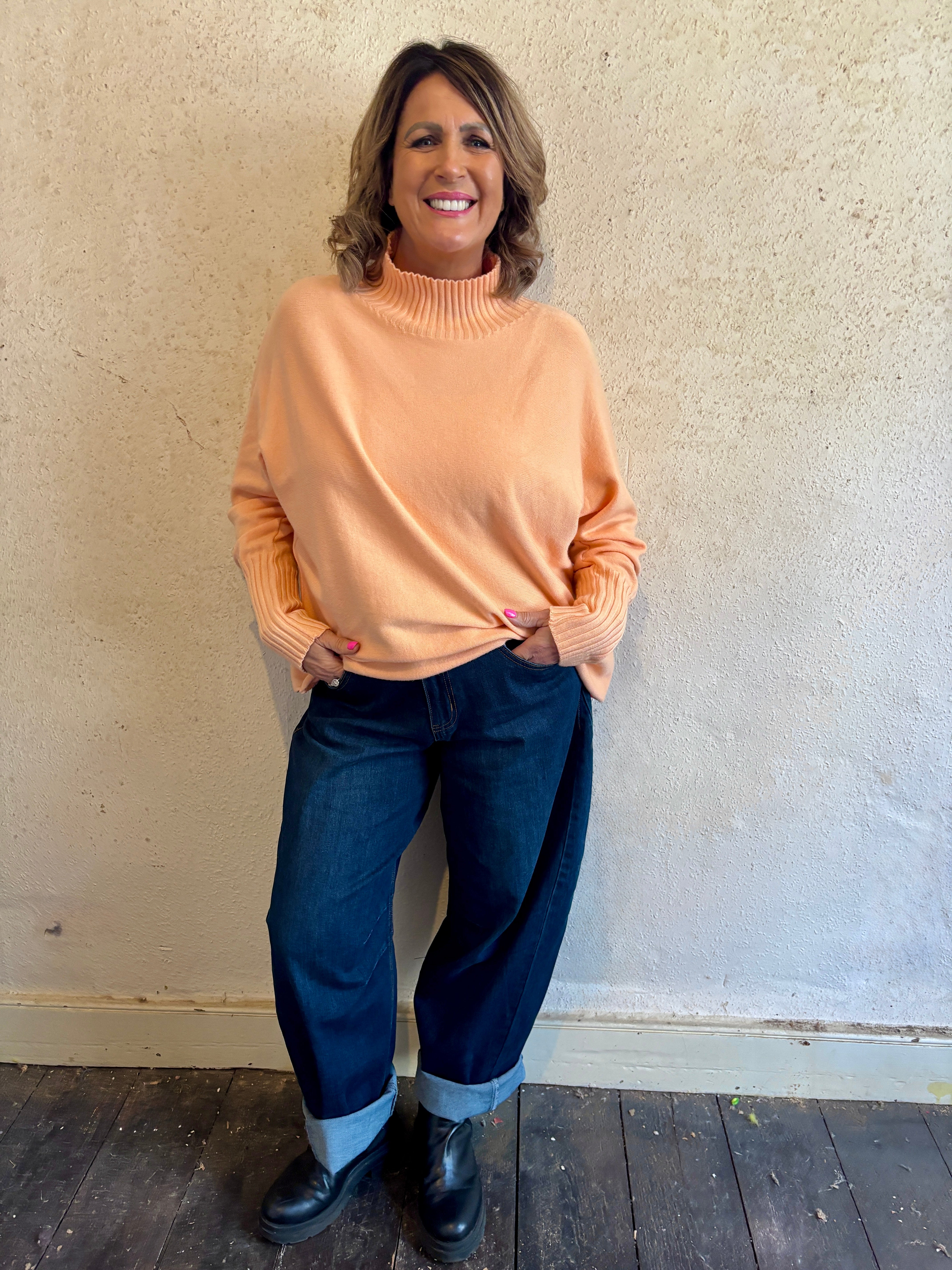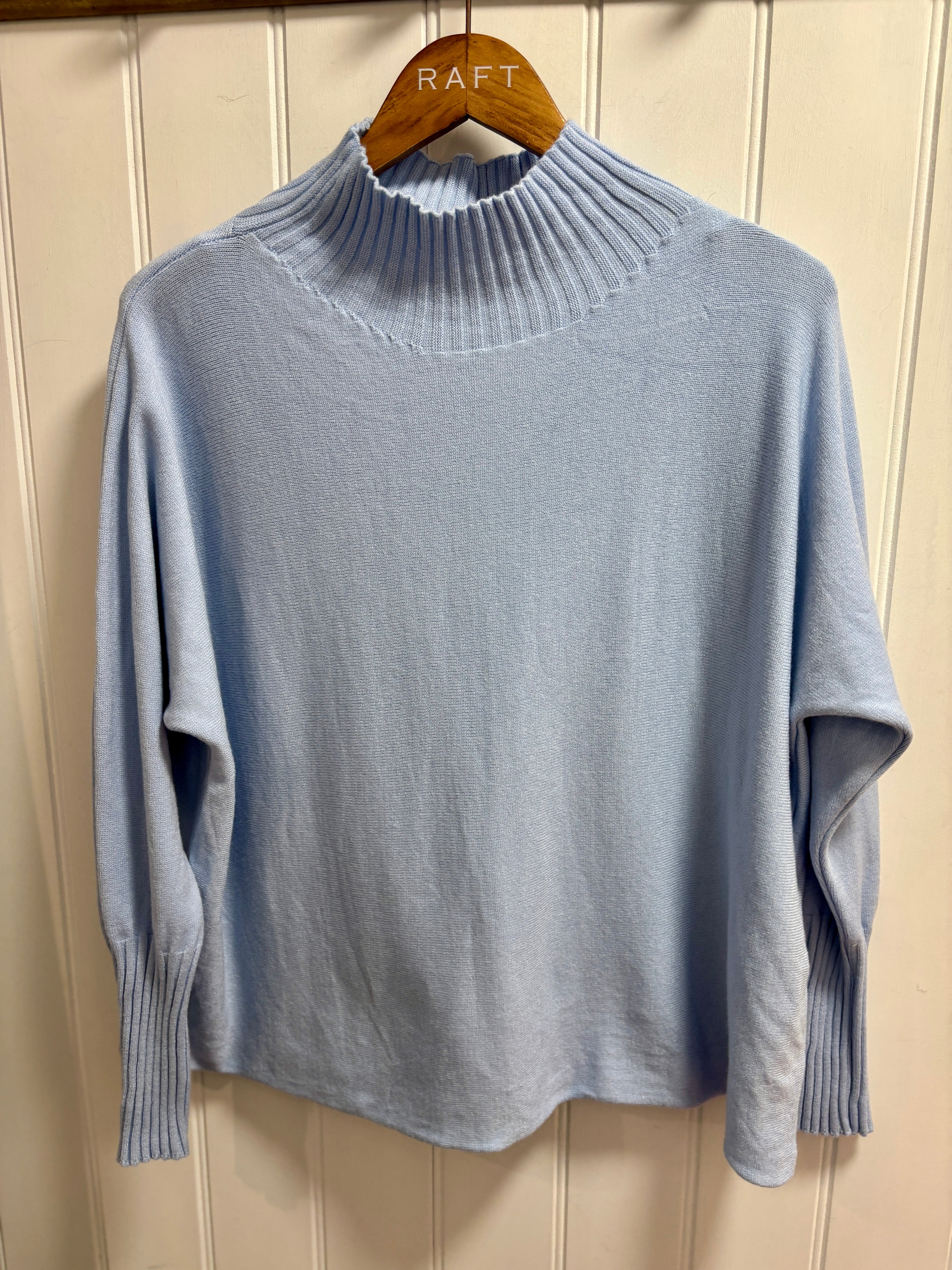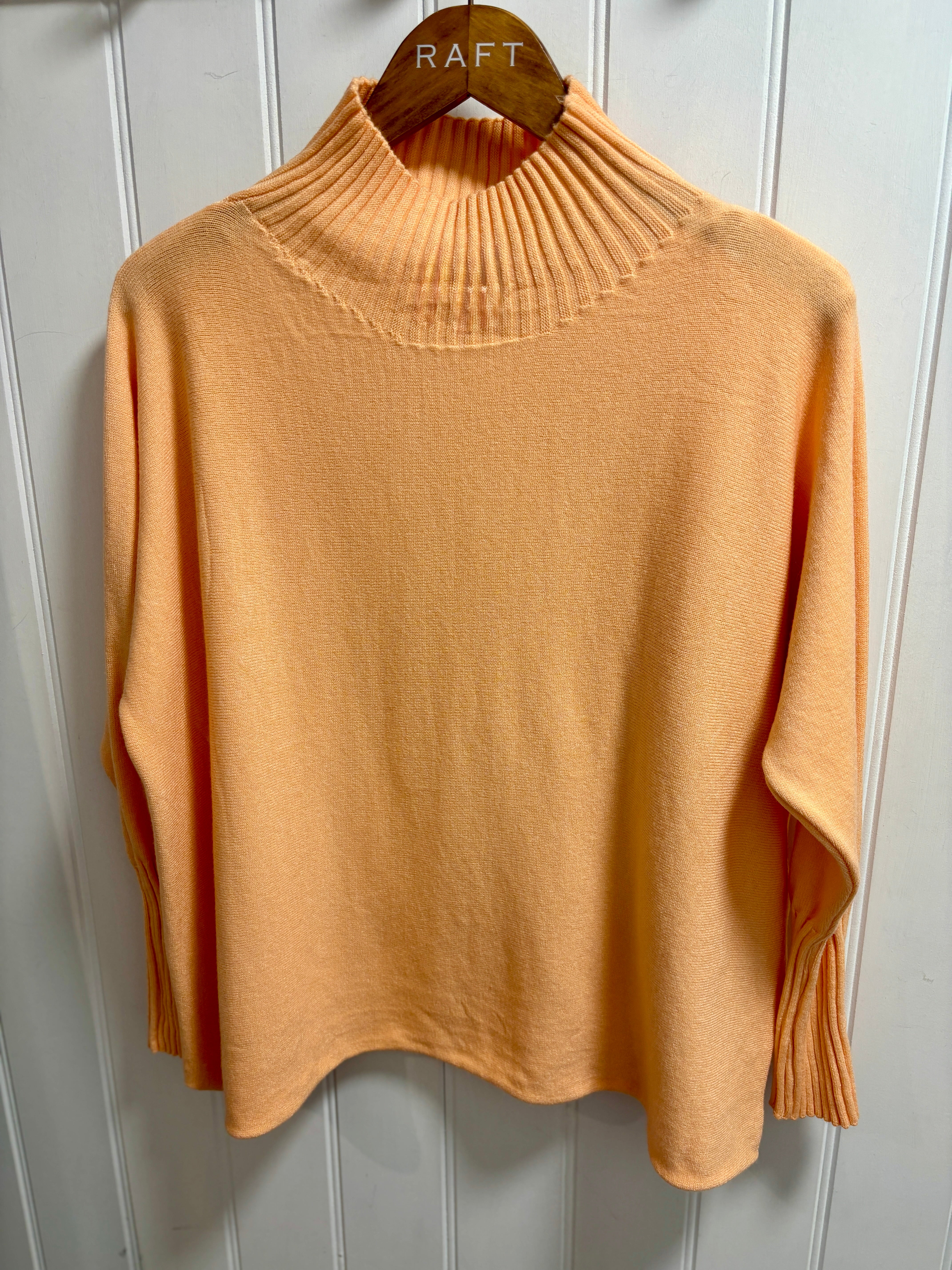 A gorgeous ribbed funnel neck with long ribbed cuffs. A stylish box shaped junper with dolman sleeves with long fitted cuffs.