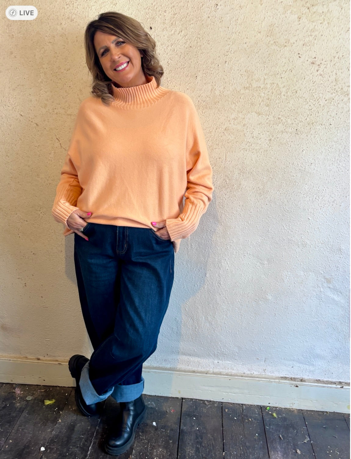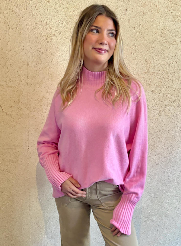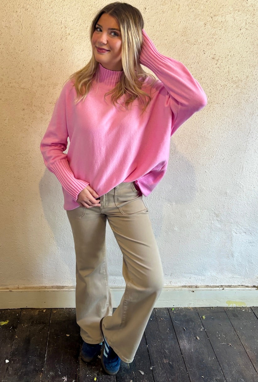 A gorgeous ribbed funnel neck with long ribbed cuffs. A stylish box shaped junper with dolman sleeves with long fitted cuffs.