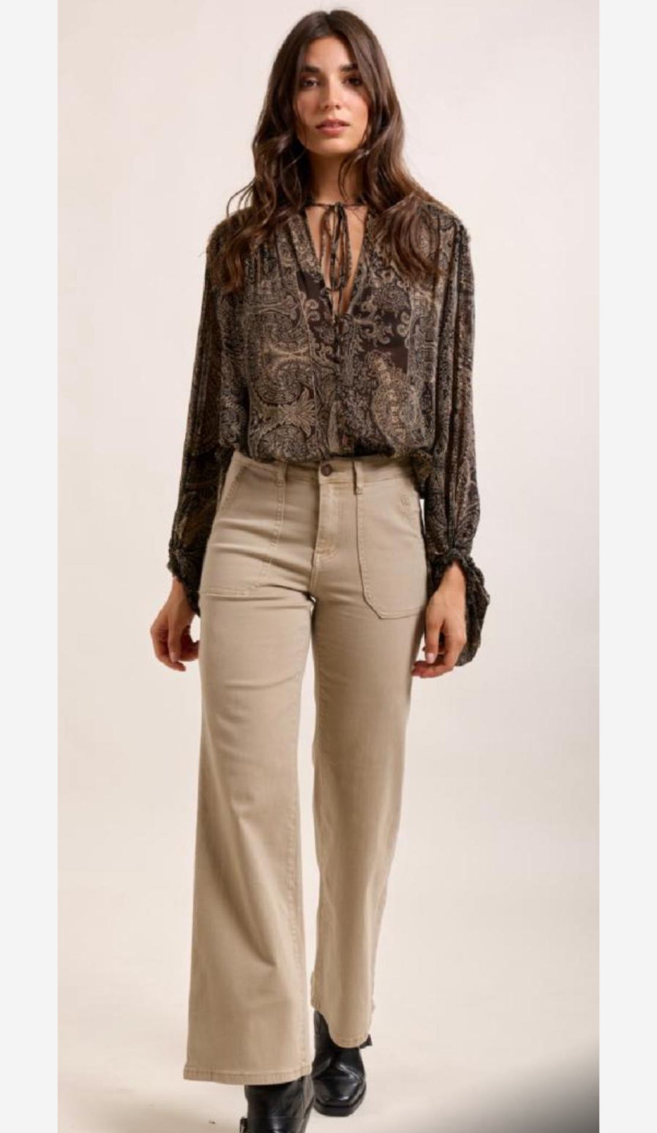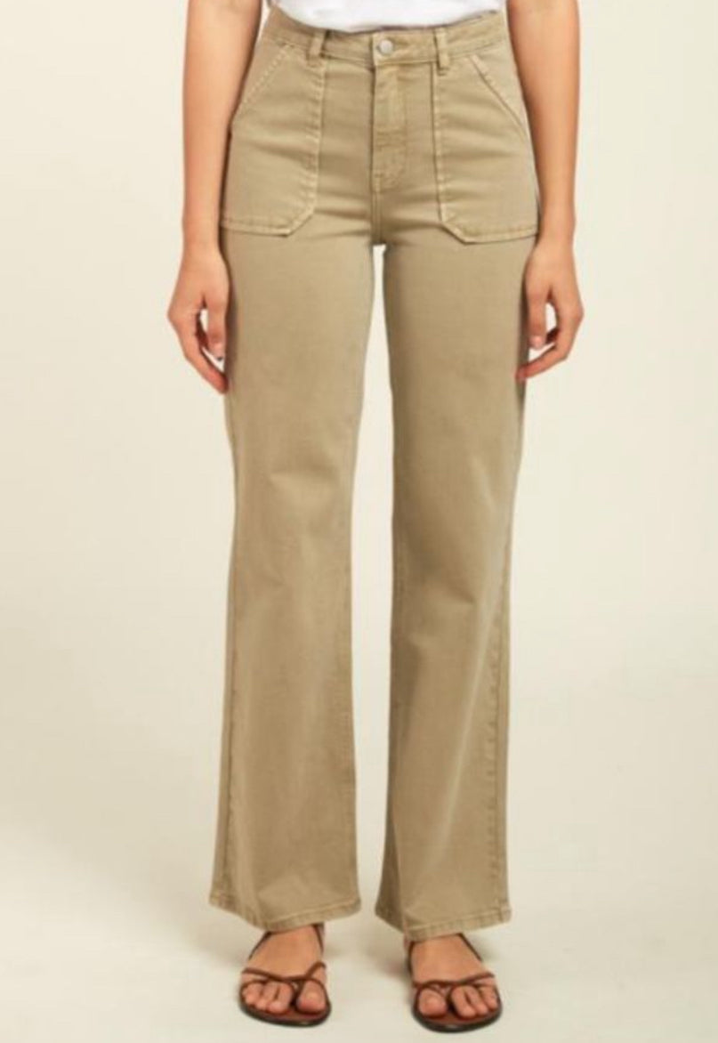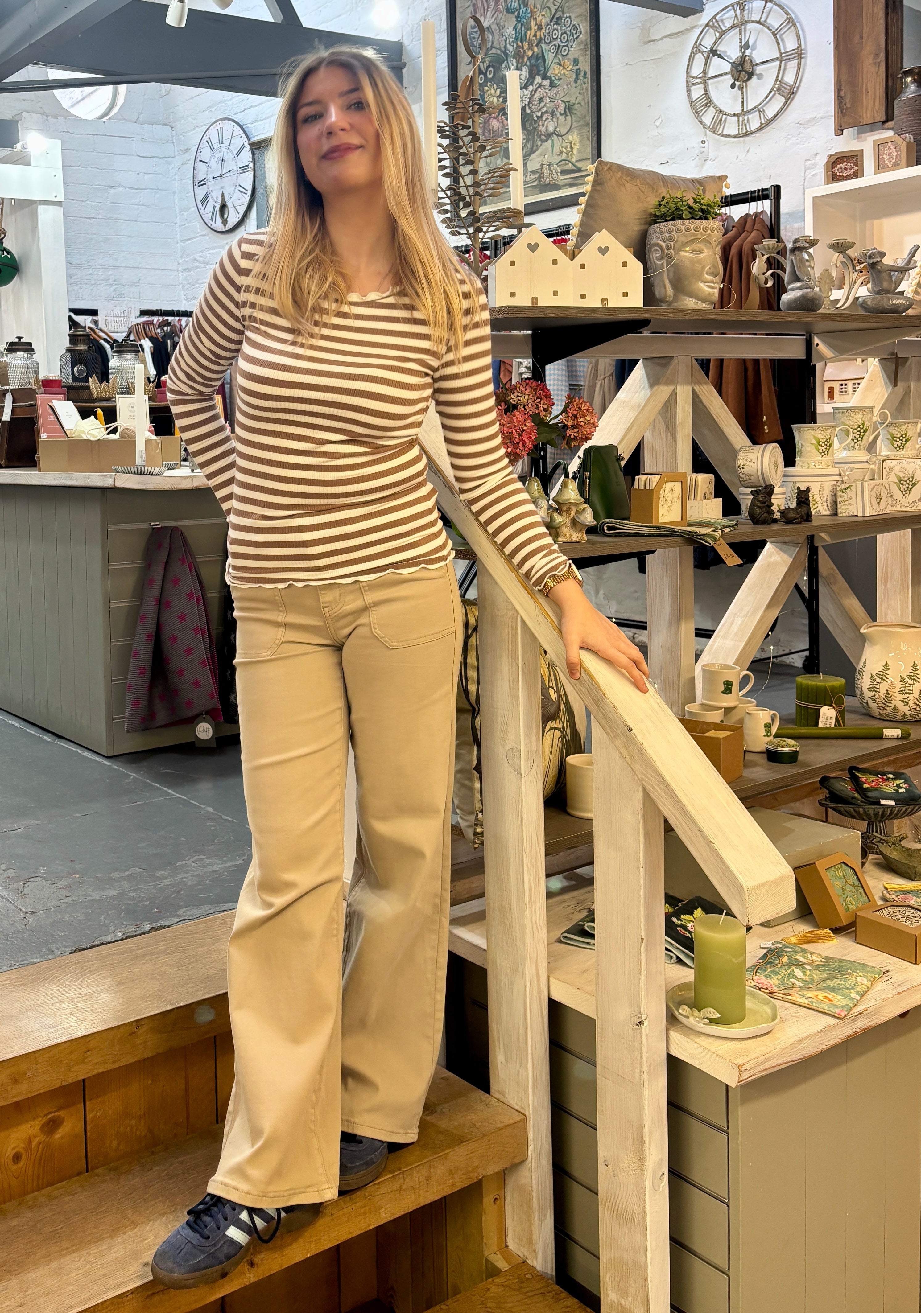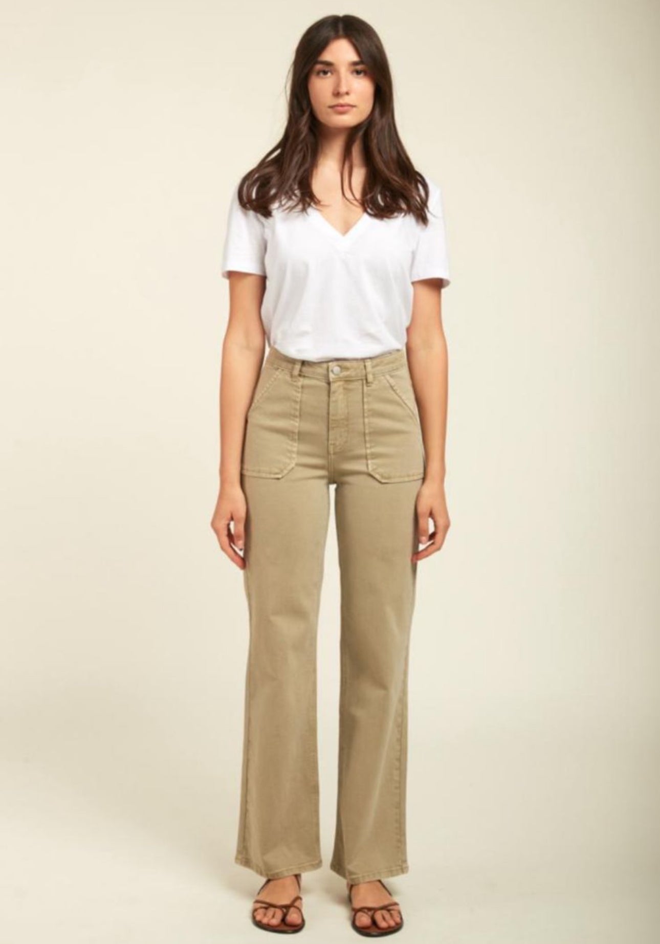 A fabulous high waisted pair of flared, stretch jeans in soft sand. Deep front pockets giving a 70's vibe. An uber comfortable fit with zip fly and button fastener.