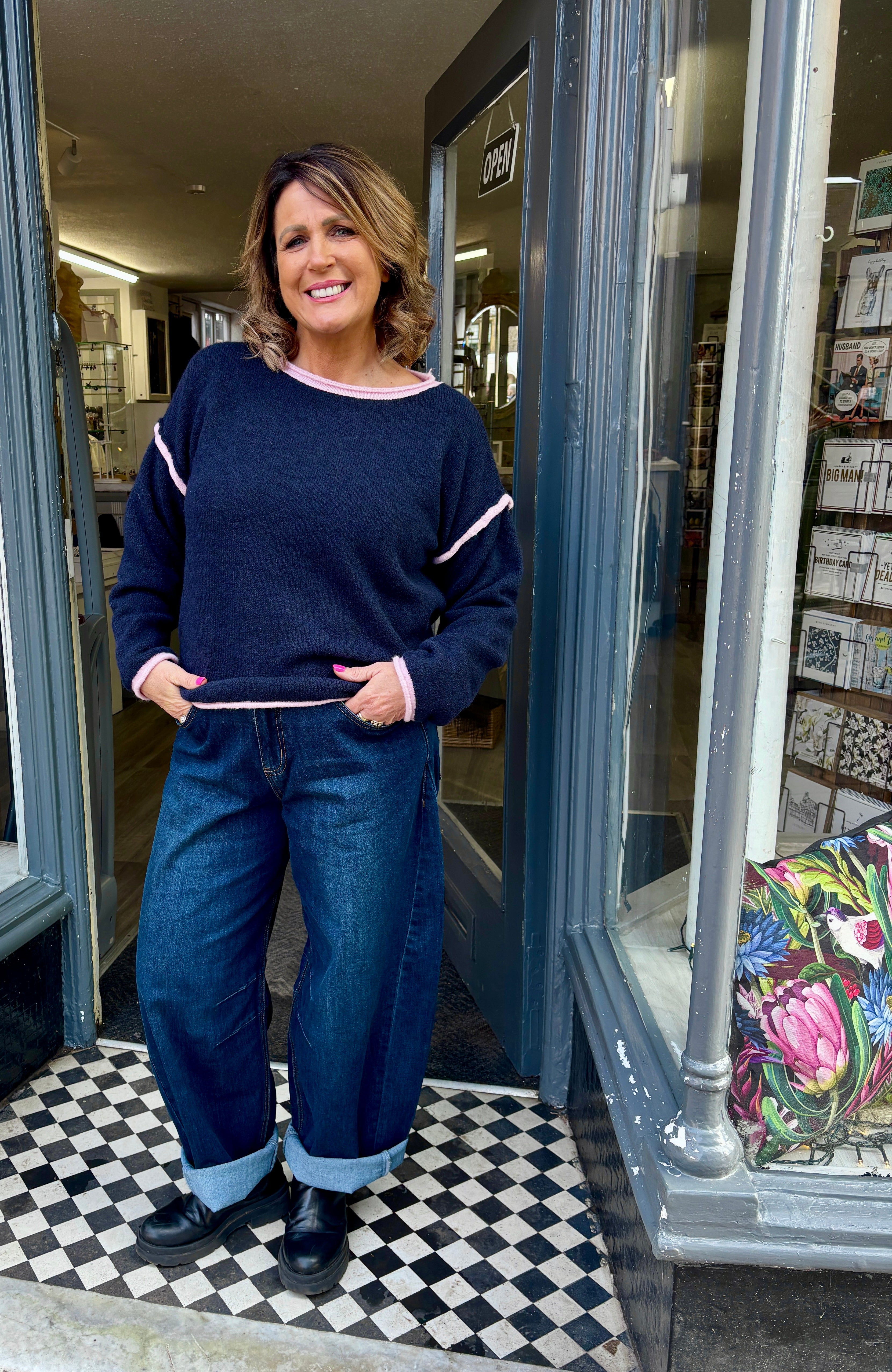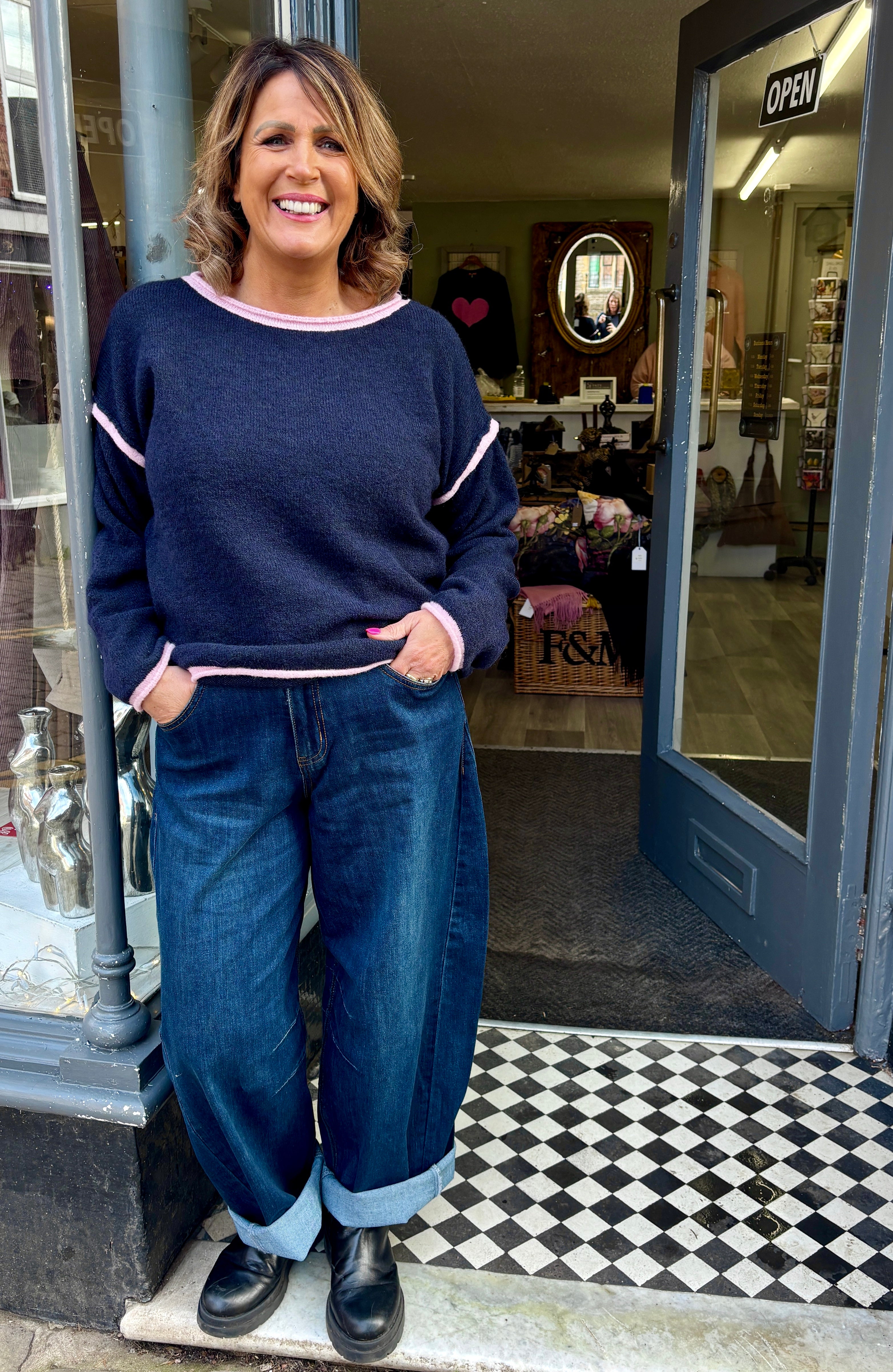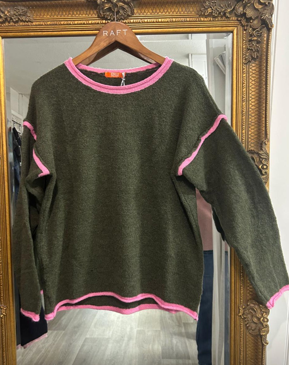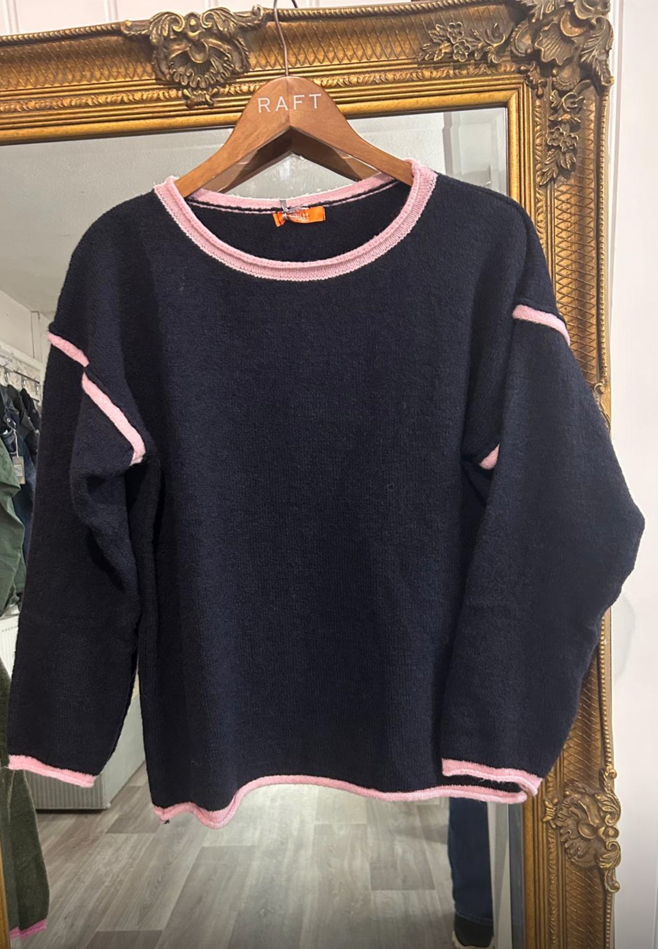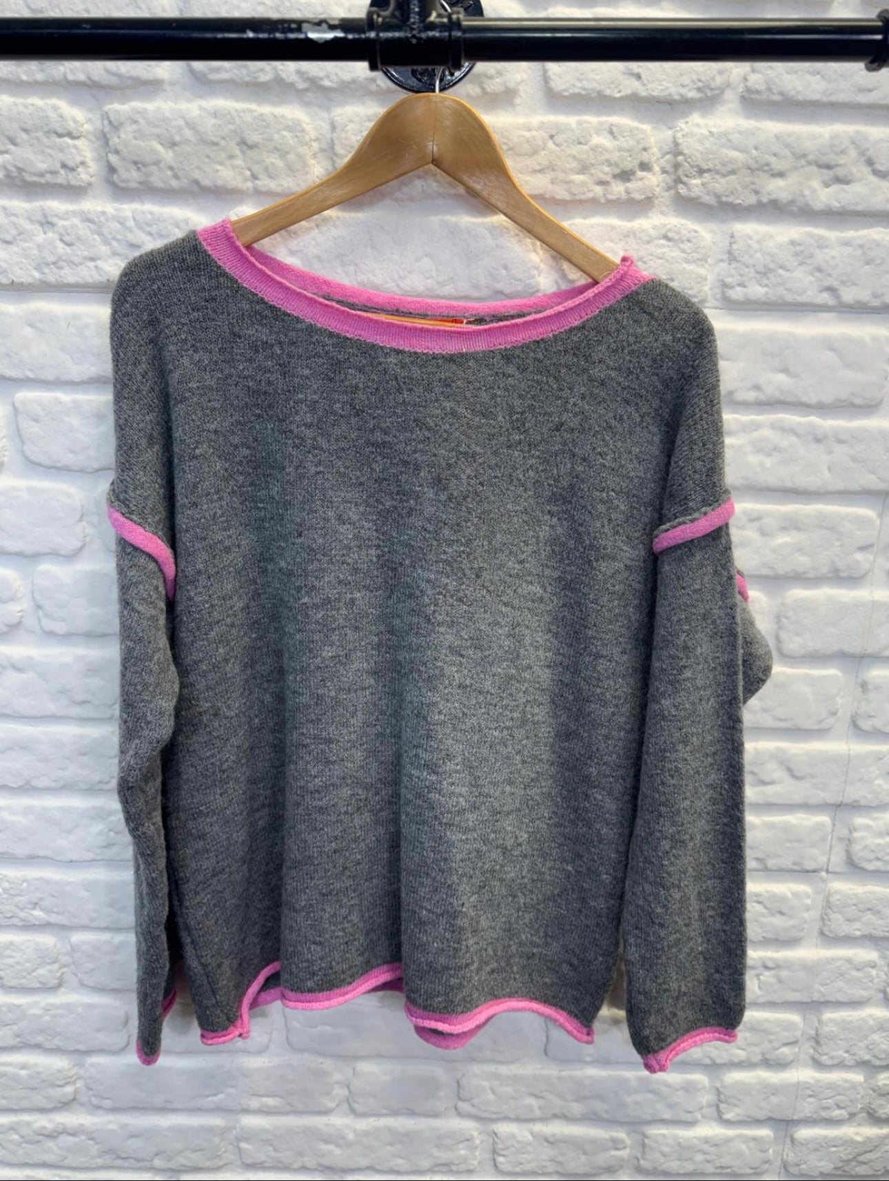 A gorgeous soft knit sweater with a pop of contrast piping on the seams. a fabulous cross season item to list your spirits with a flash of brightness.