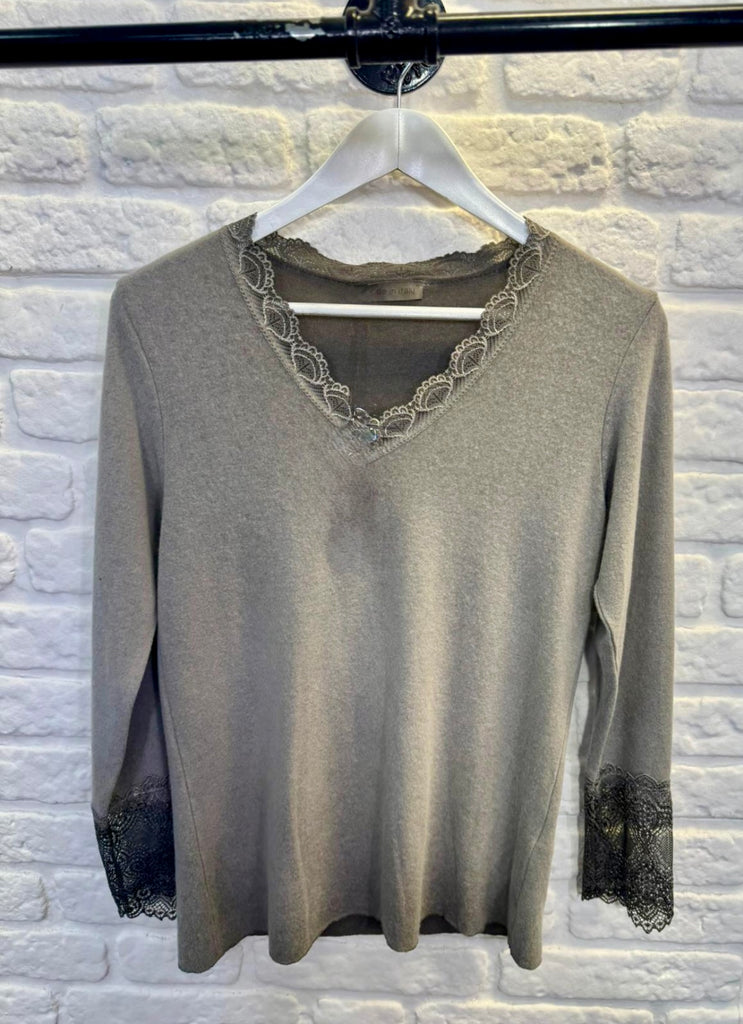 A gorgeous v neck, long sleeved top in soft brushed jersey fabric with great stretch and light warmth. A wide band of lace gives teh sleeve ending the full length and match lace trim edges the neckline.